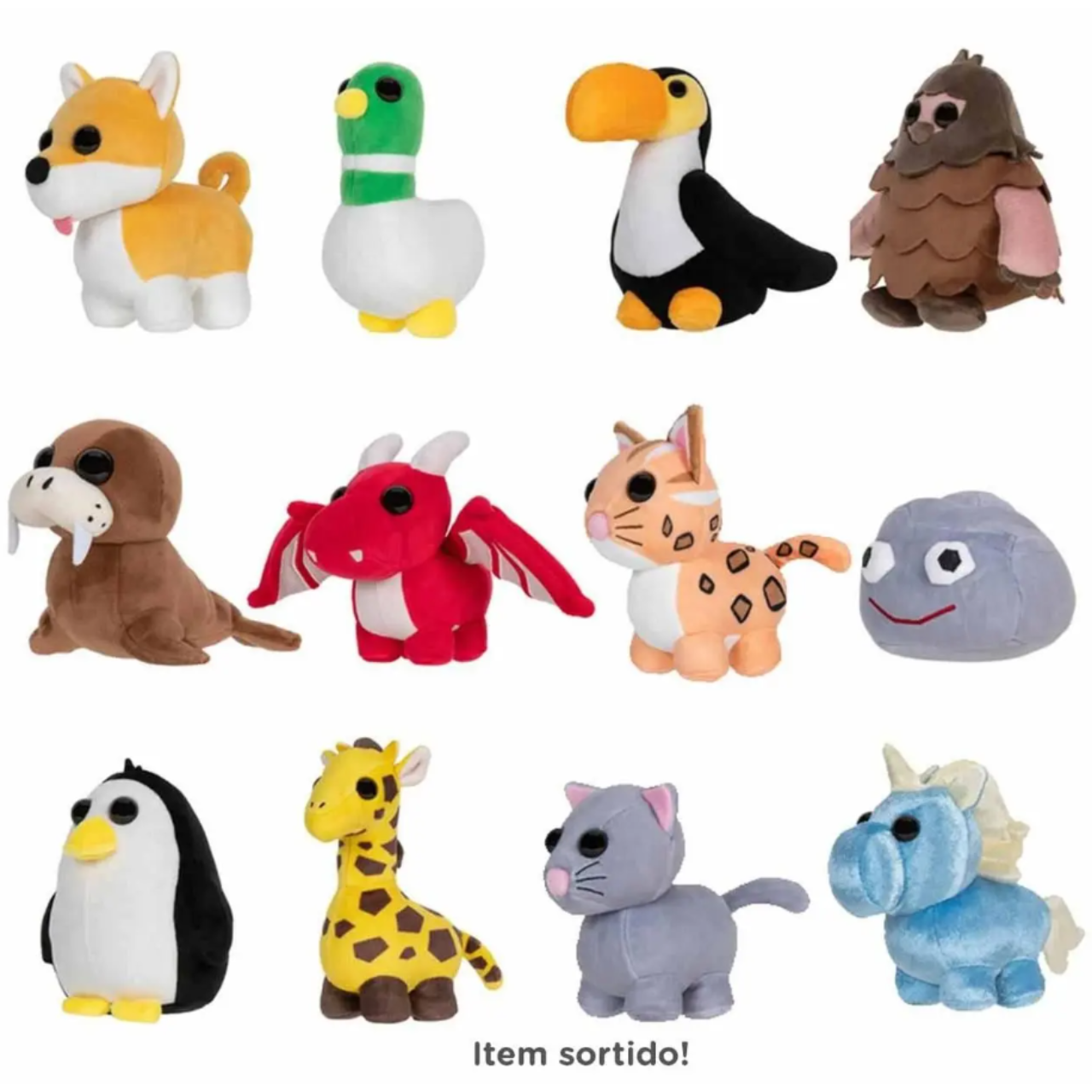 São 12 pelúcias diferentes e sortidas para você colecionar e se encantar.
