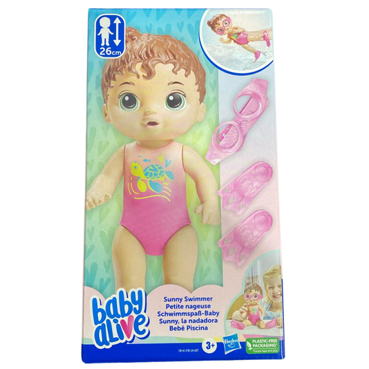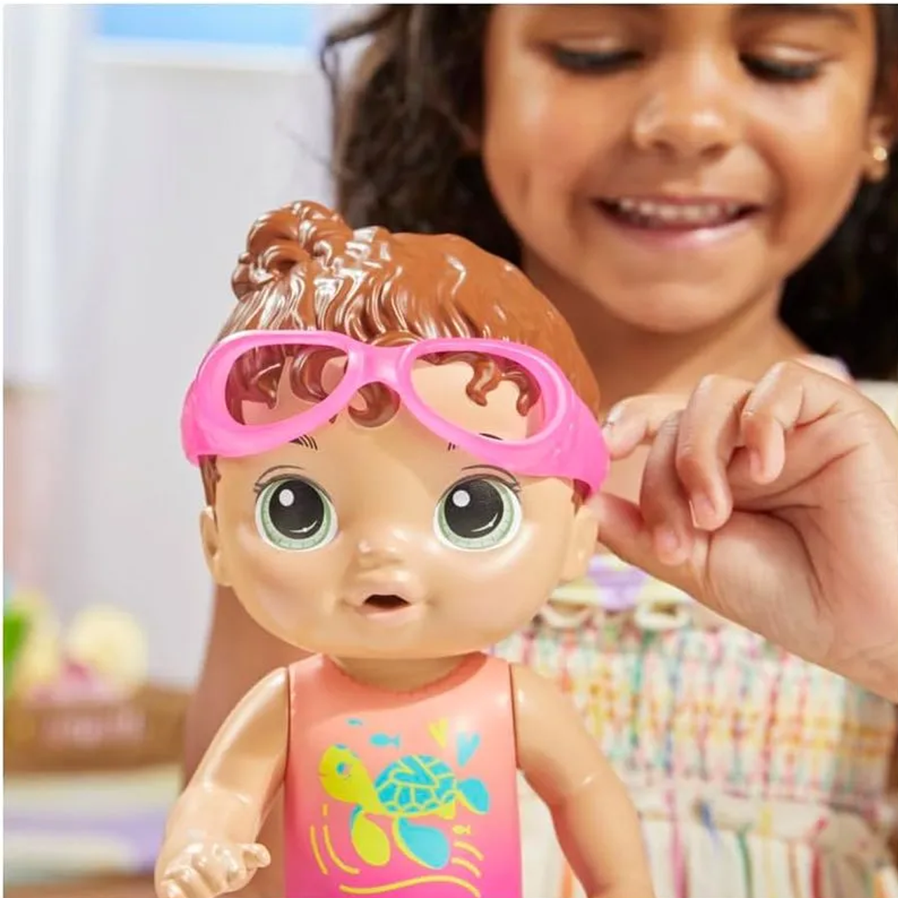 A boneca Baby Alive está pronta para muitas aventuras aquáticas, ela vem com óculos e 2 nadadeiras.