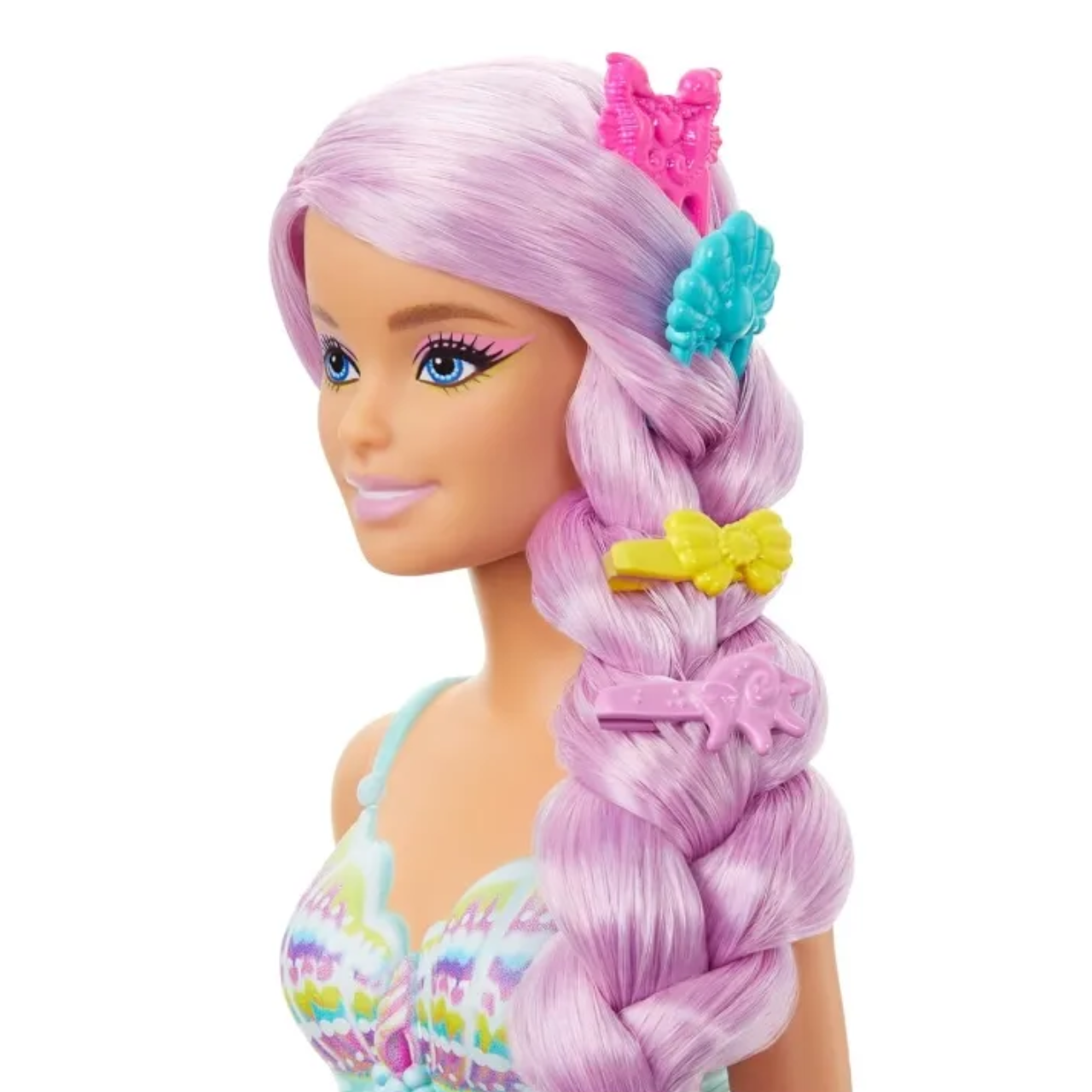 Crie penteados incríveis e embarque em aventuras subaquáticas com a Barbie Sereia e seu cabelo longo!