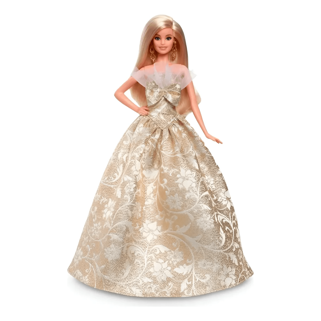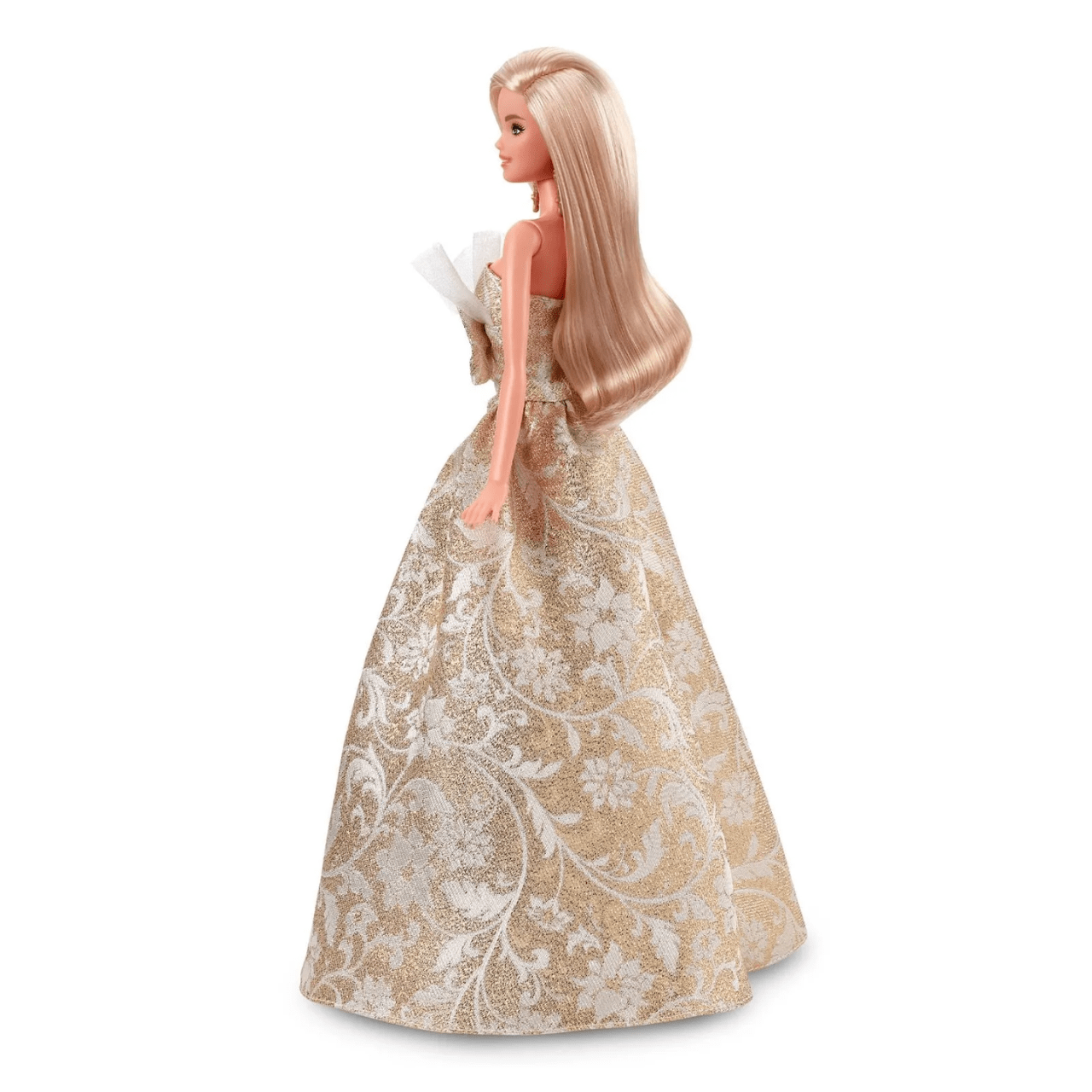 A Barbie Holiday 2025 é a verdadeira essência do glamour natalino. Vestida com um deslumbrante vestido prateado e dourado, ela reflete o brilho das festas de fim de ano, equilibrando o clássico e o contemporâneo. O tecido, rico em detalhes metálicos, brilha suavemente sob a luz, enquanto o corte volumoso do vestido evoca um clima de celebração e elegância.