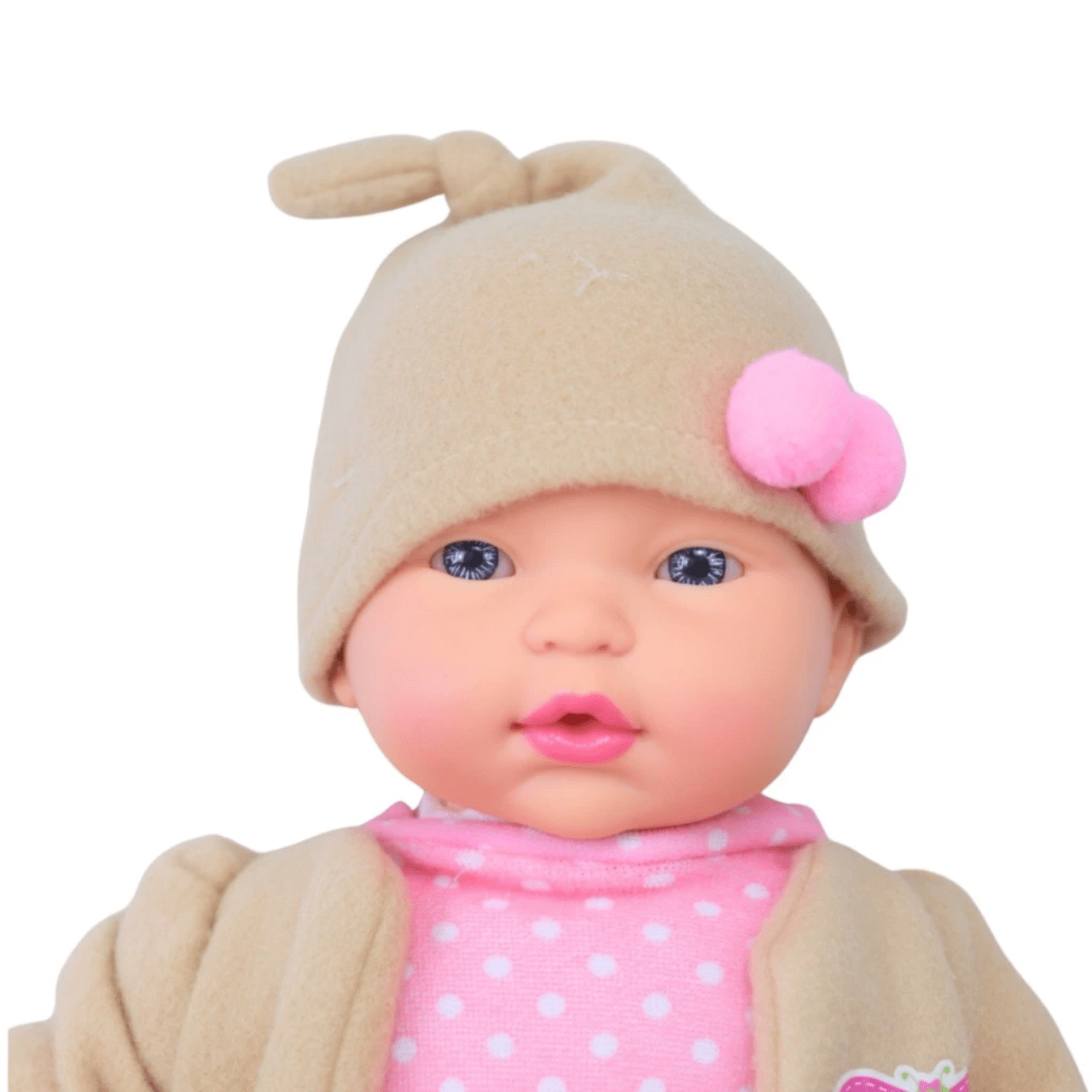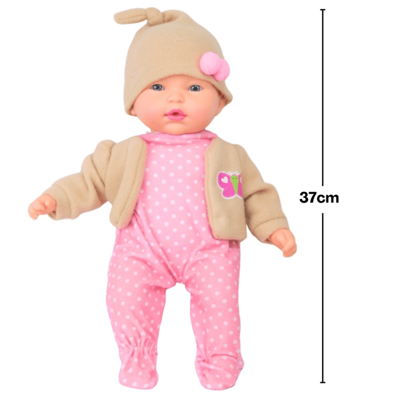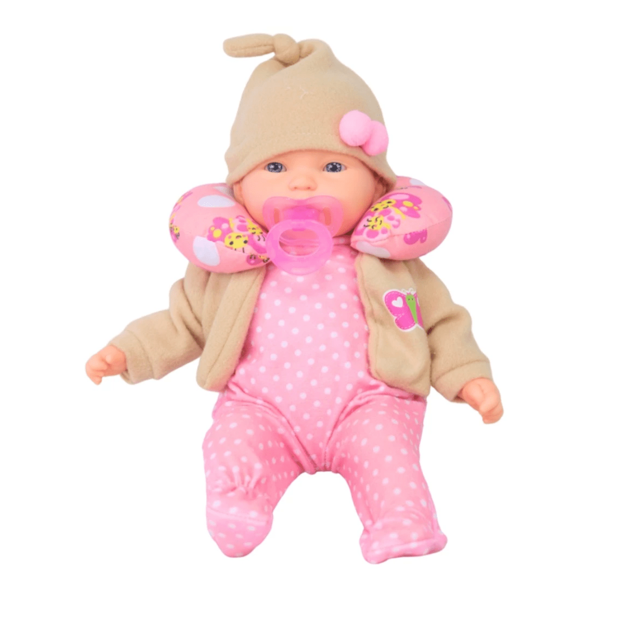 Conteúdo da embalagem: 1 Boneca, 1 Chupeta, 1 Mamadeira, 1 Ursinho de tecido e 1 Almofada de Pescoço.