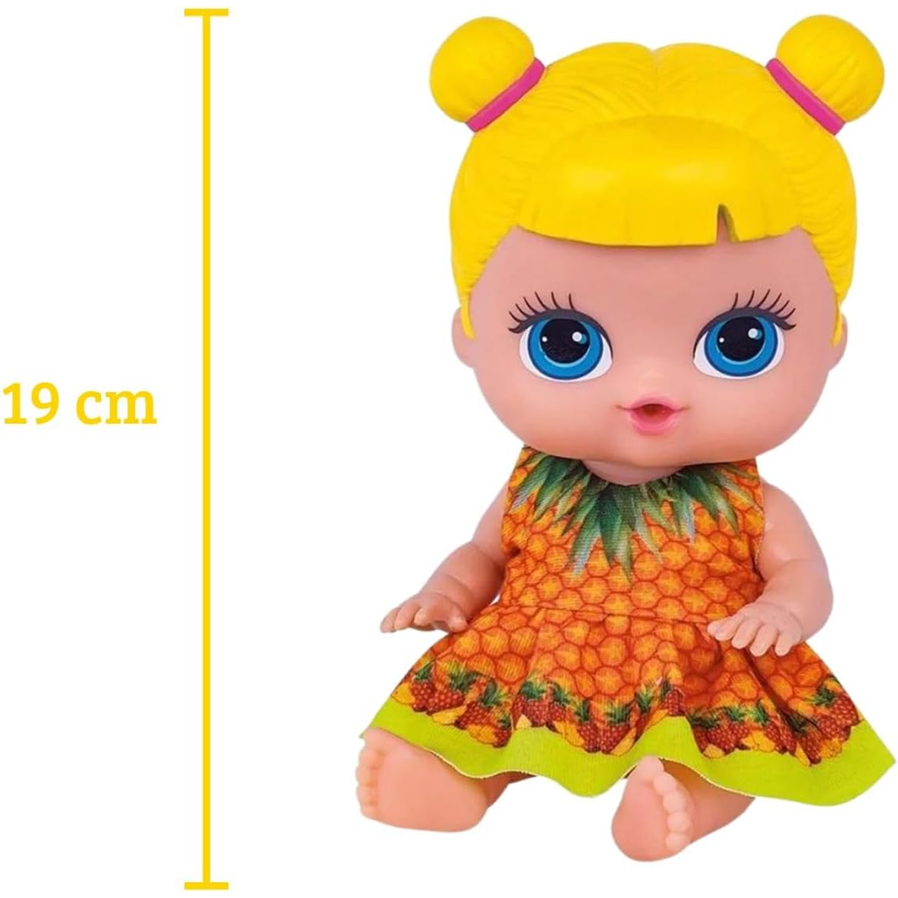 A Boneca tem aproximadamente 19 centímetros e vem com cheirinho de abacaxi de verdade.