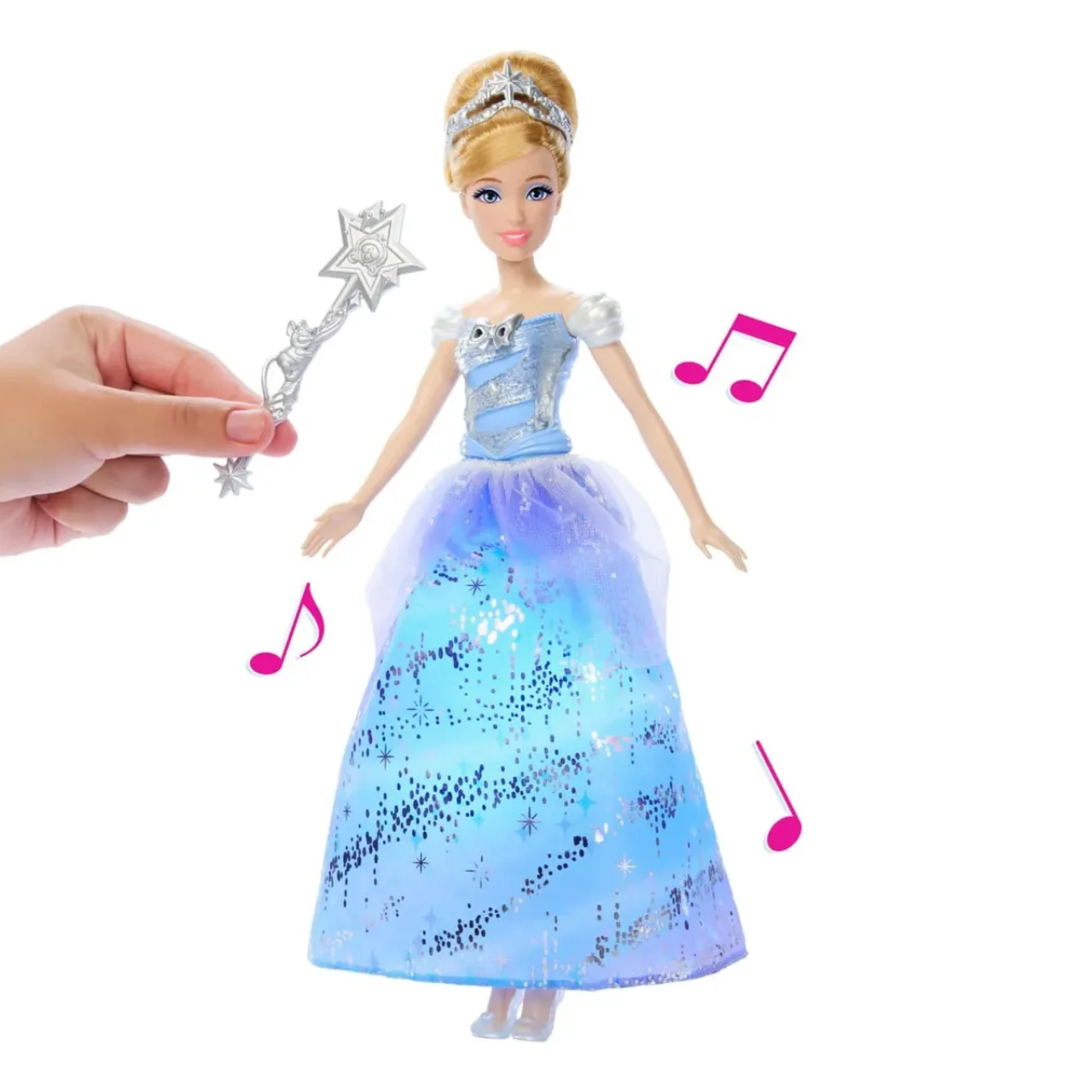 - Ao acenar a varinha (ou a mão), o vestido da Cinderela se transforma em luzes coloridas enquanto sons mágicos são ativados, recriando a cena emocionante do filme.