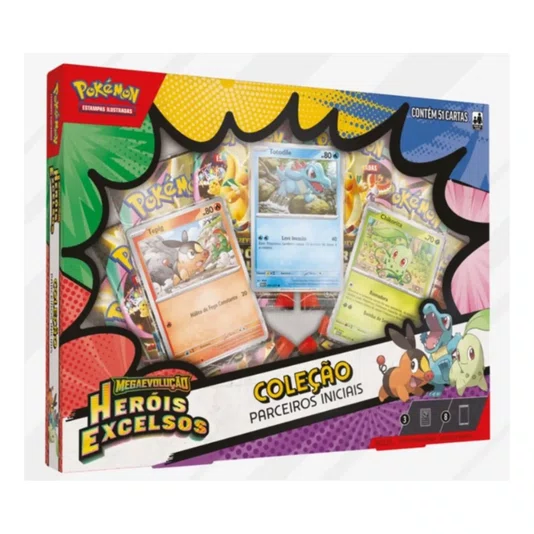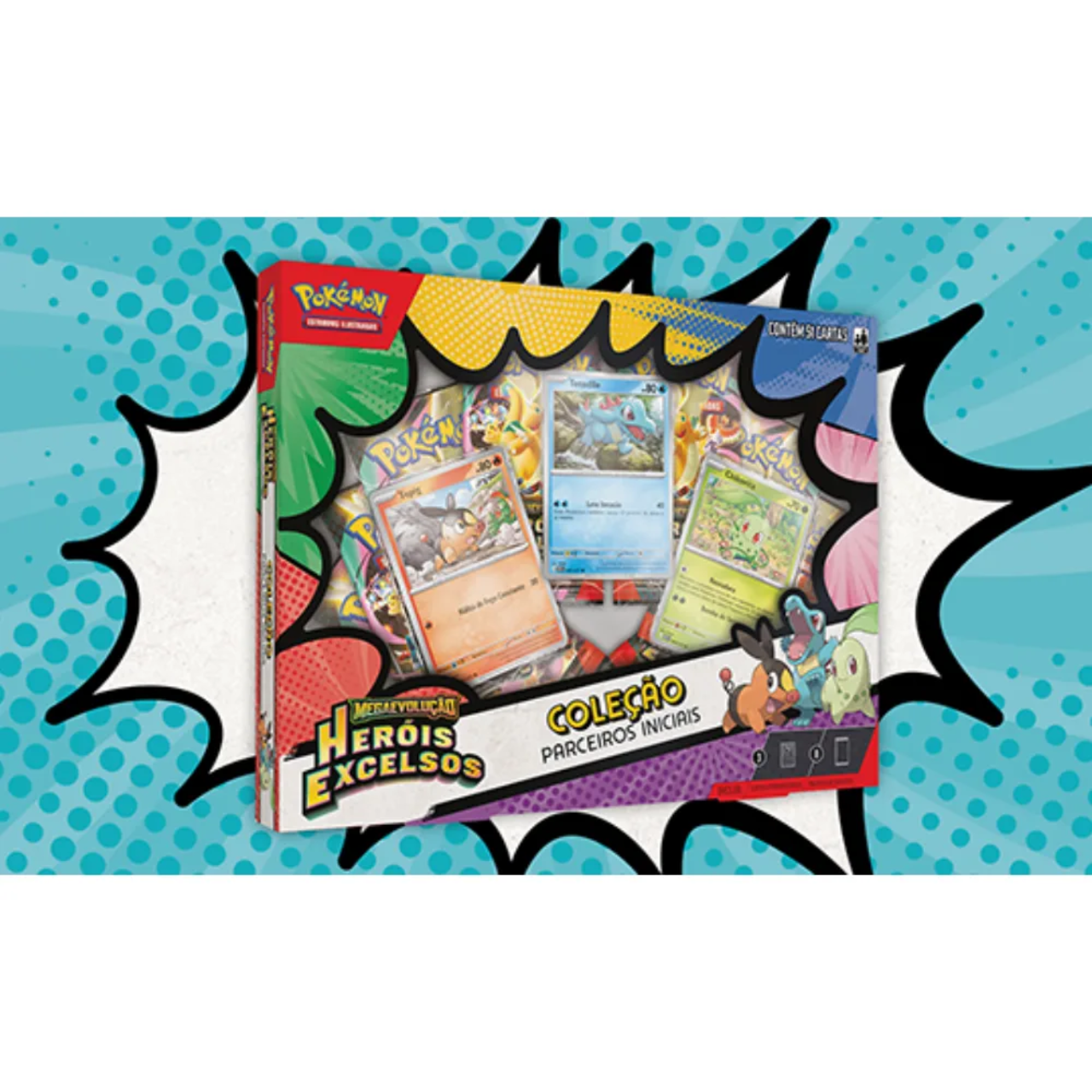 A Coleção Parceiros Iniciais de Megaevolução Heróis Excelsos do Pokémon Estampas Ilustradas destaca o começo de toda aventura Pokémon ao reunir Chikorita, Tepig e Totodile em cartas promocionais laminadas com acabamento especial.