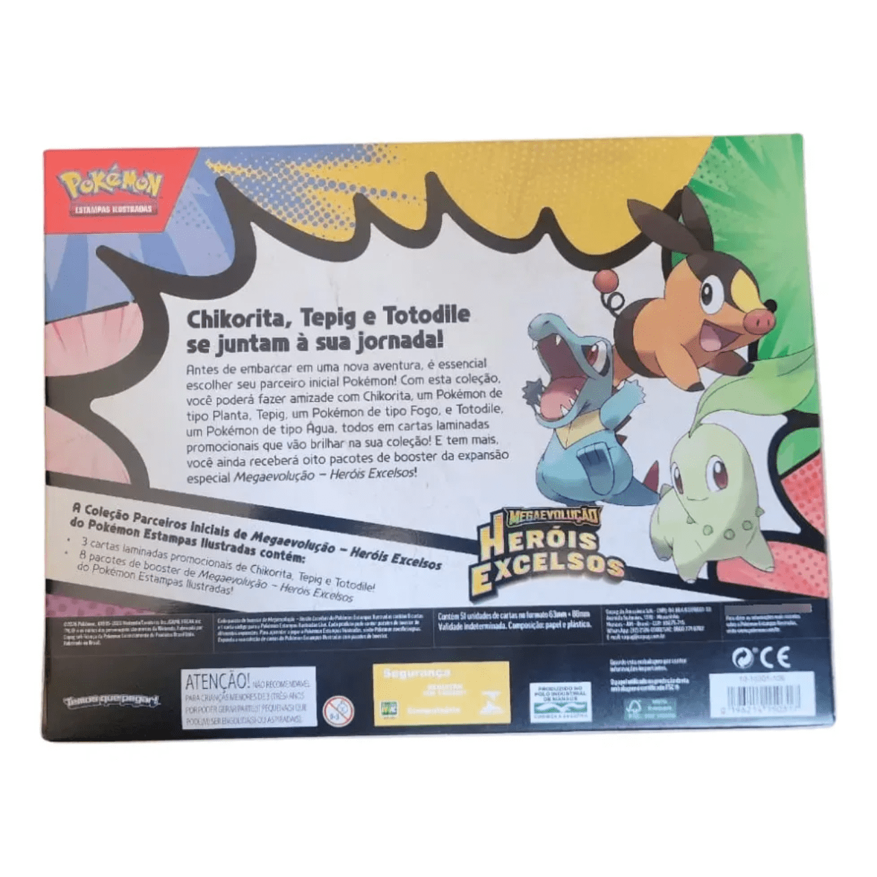 Conteúdo da embalagem: 3 Cartas laminadas promocionais de Chikorita, Tepig e Totodile, 8 Pacotes de booster de Megaevolução Heróis Excelsos do Pokémon Estampas Ilustradas.