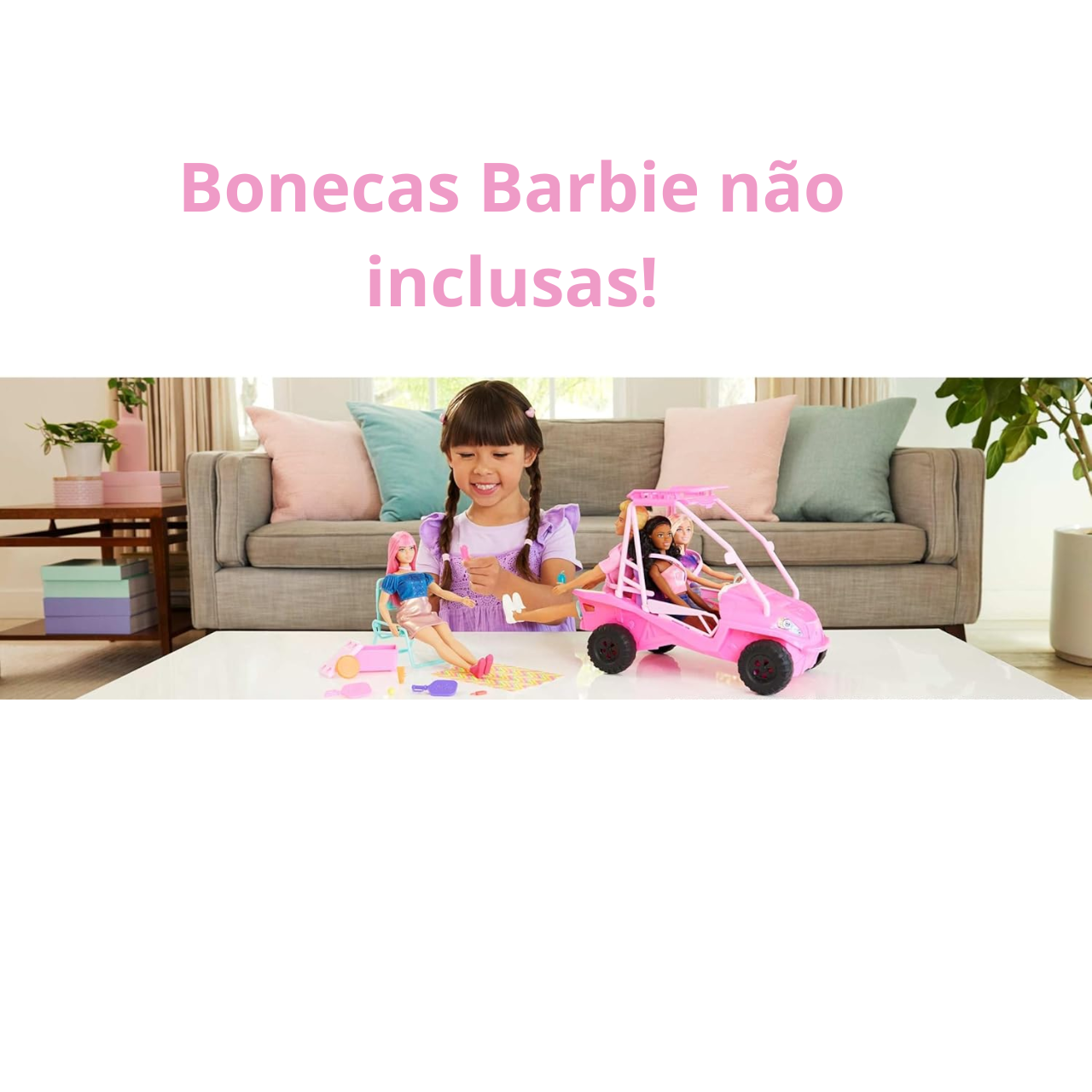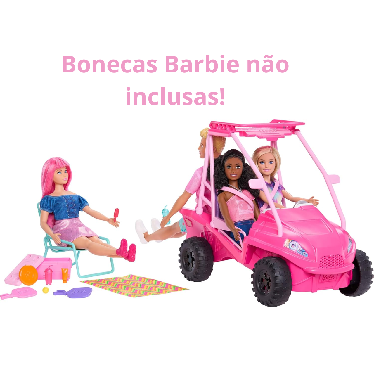 Este Buggy é um veículo inspirado na série da Barbie, com design rosa e espaço para até quatro bonecas (vendidas separadamente). Ele permite que as crianças levem suas bonecas para aventuras na praia, estimulando a imaginação e a criação de histórias.