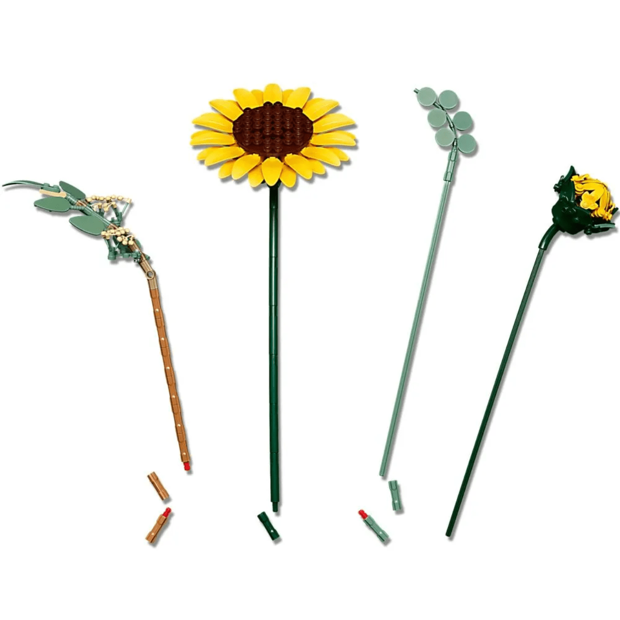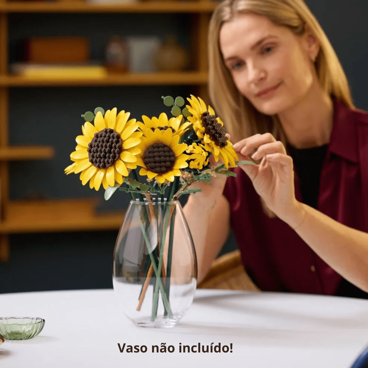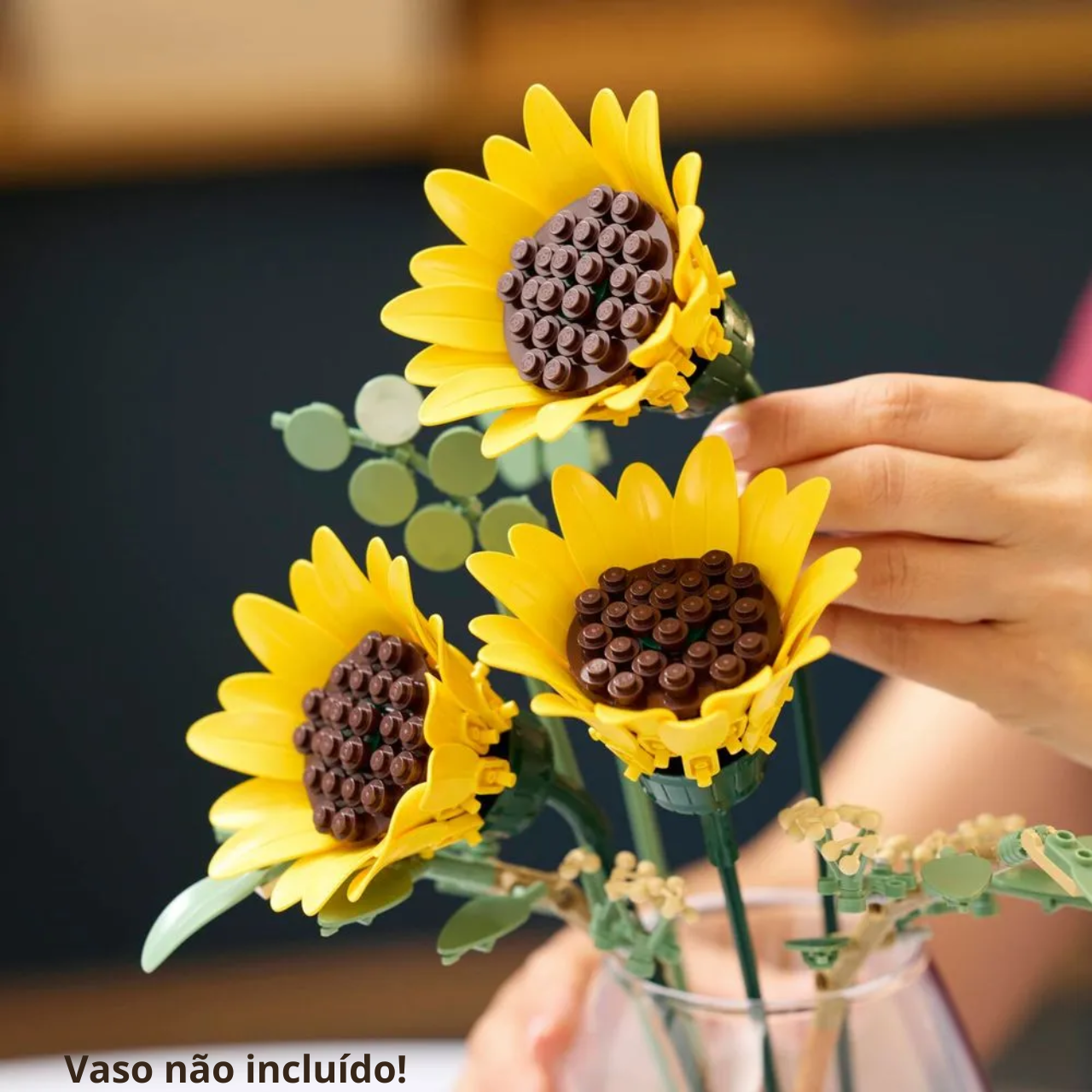 Este é um conjunto de construção para adultos que permite criar um buquê realista com 6 girassóis em diferentes estágios de desenvolvimento, incluindo botão, flores em abertura e flores totalmente abertas, além de 4 hastes de eucalipto. As pétalas e hastes são ajustáveis, possibilitando personalizar o arranjo e explorar a criatividade na montagem.