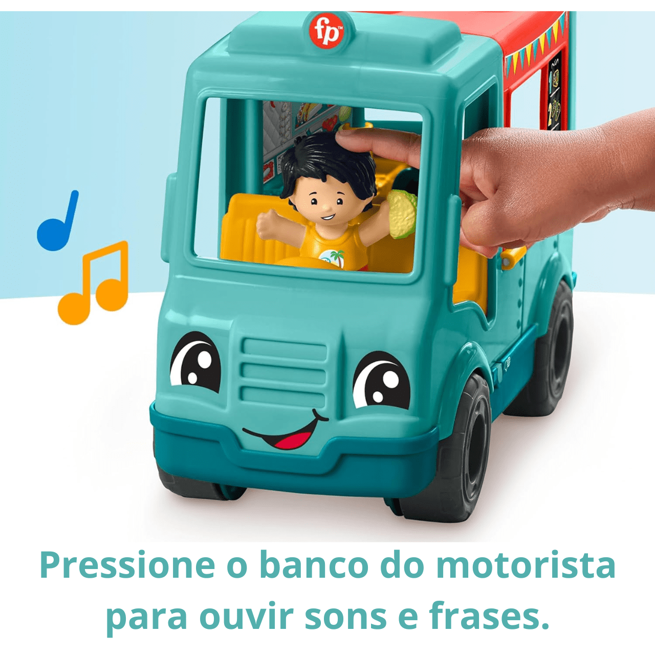 Projetado no tamanho ideal para as mãos pequenas, o veículo inclui 2 personagens Little People para deixar as histórias ainda mais completas. Também possui um botão interativo que permite escolher entre os idiomas Inglês, Espanhol, Francês e Português do Brasil, e funciona com 2 pilhas AA já inclusas, garantindo praticidade e diversão desde o primeiro uso.