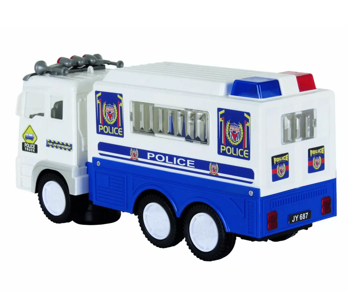 O caminhão possui detalhes idênticos aos carros de policia, com luz 3D e rotação este veículo é perfeito para crianças a partir dos 3 anos.