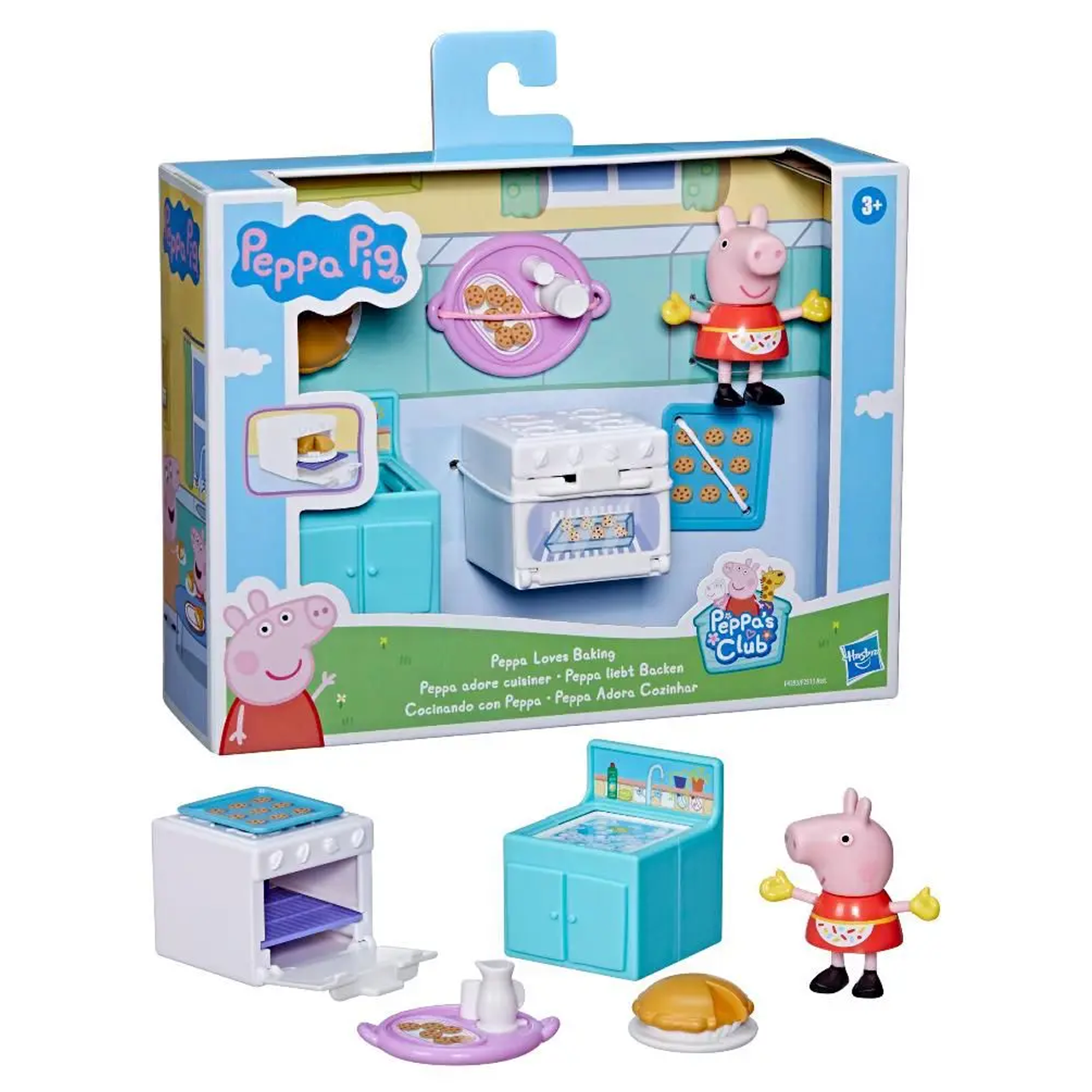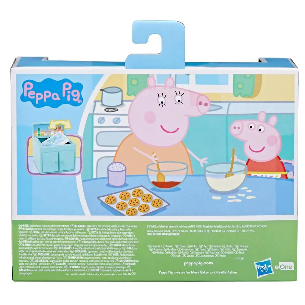 As crianças vão se divertir com a figura da Peppa de avental e luvas de cozinha, além da pia de cozinha com dois lados reversíveis (limpo e sujo), inclui também um forno com grelha que desliza para fora para colocar a assadeira de biscoitos. A Peppa pode servir suas guloseimas para a família e amigos com os acessórios de bandeja de biscoitos e prato com torta.