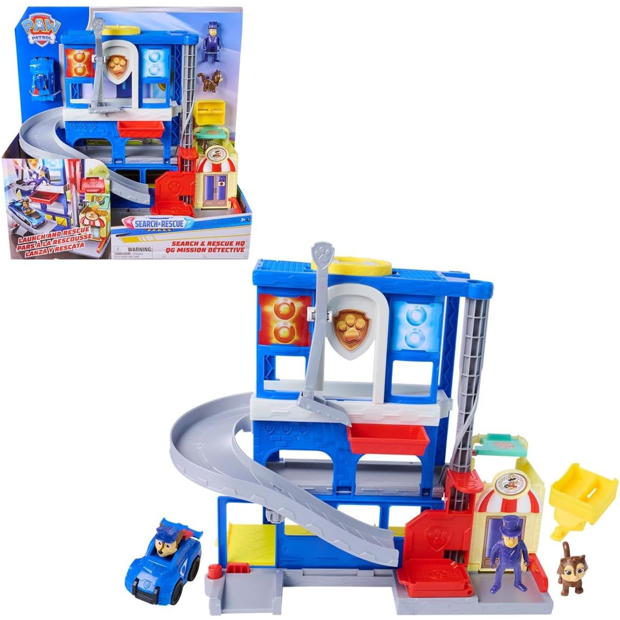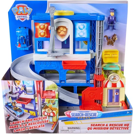 O Quartel General Search & Rescue da Patrulha Canina transforma a brincadeira em grandes missões de resgate. O conjunto possui elevador giratório deslizante, lançador de veículos e espaço para até seis carros, acompanhando Chase em aventuras cheias de ação.