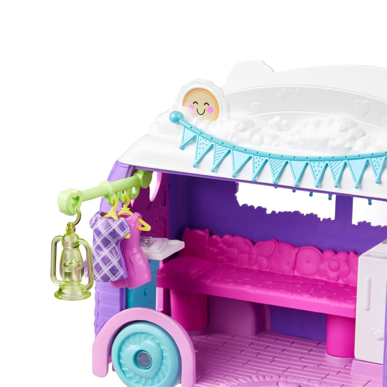 A vibrante van de acampamento não é só um veículo, mas um mundo de possibilidades. Com cores alegres e um design detalhado, a van se abre de forma surpreendente, revelando um espaço interno totalmente equipado para acampamentos de luxo. Dentro, você encontra um compartimento para guardar roupas, um balanço de árvore e até um toquinho de árvore que se transforma em um cenário perfeito para momentos de descanso.