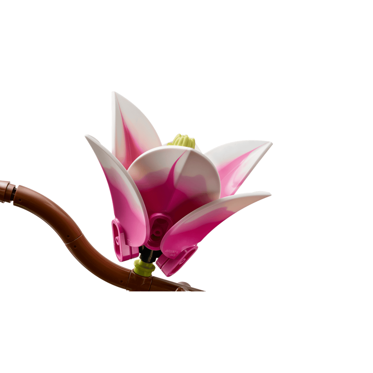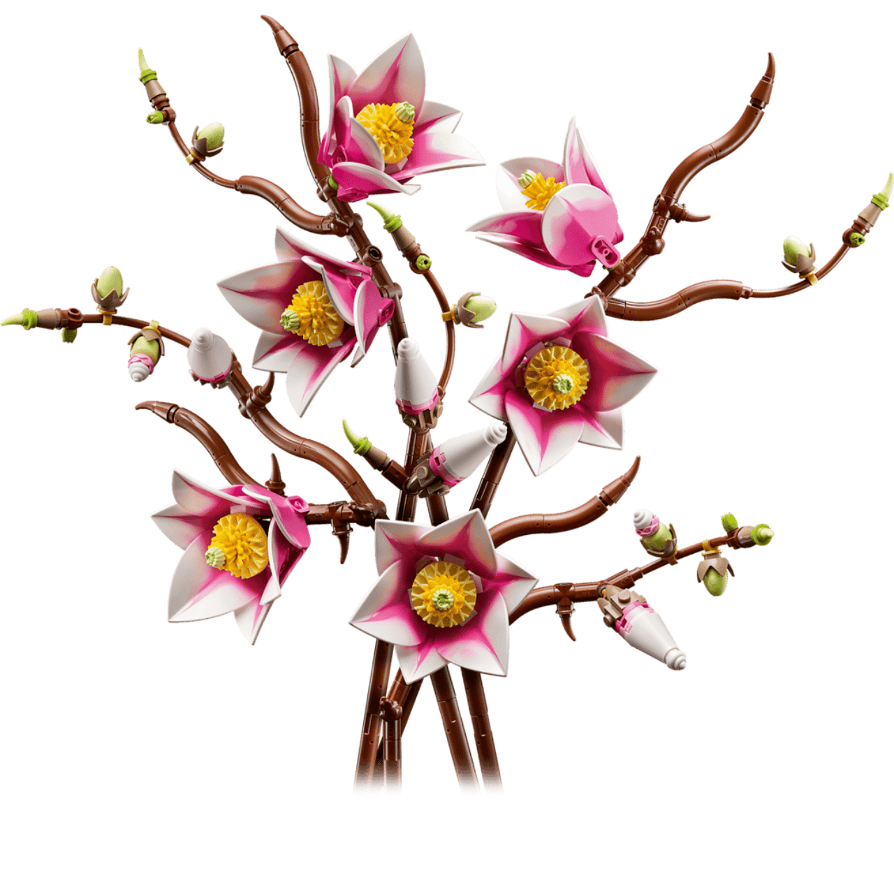 Este é um conjunto de construção para adultos que permite criar um elegante arranjo floral com 5 ramos de magnólia altamente detalhados. As pétalas apresentam dois tons para um visual mais realista, e o conjunto traz diversos elementos criativos escondidos, como peças inspiradas em cupcakes, sapos, ovos e gelados, adicionando um toque lúdico à experiência de montagem.