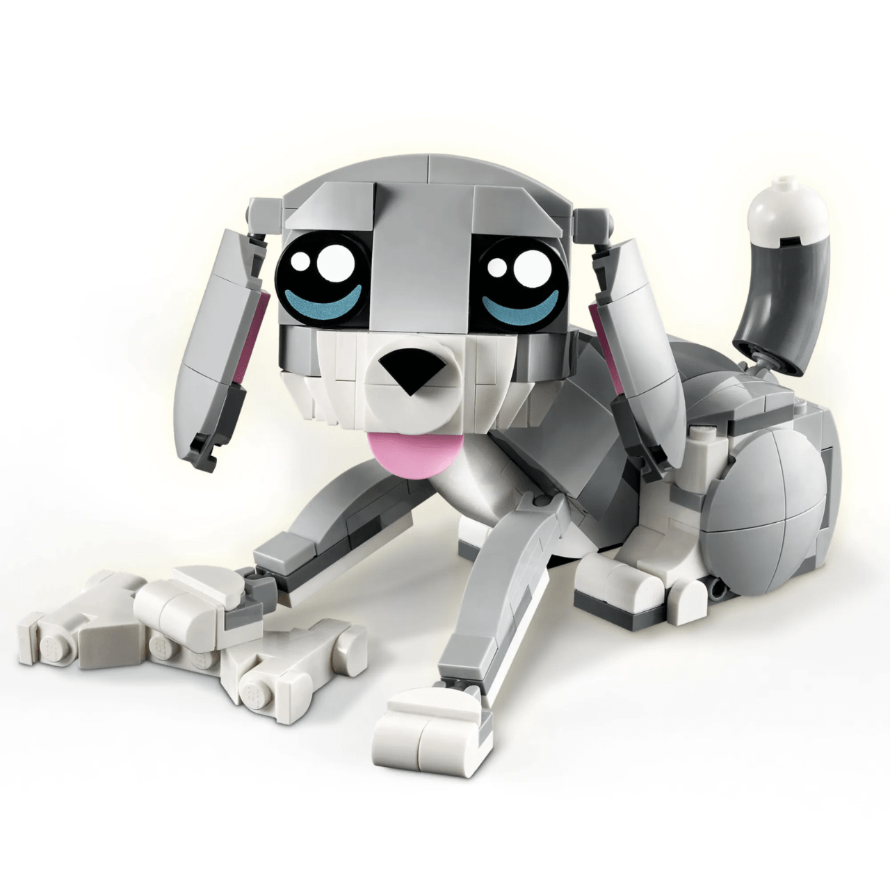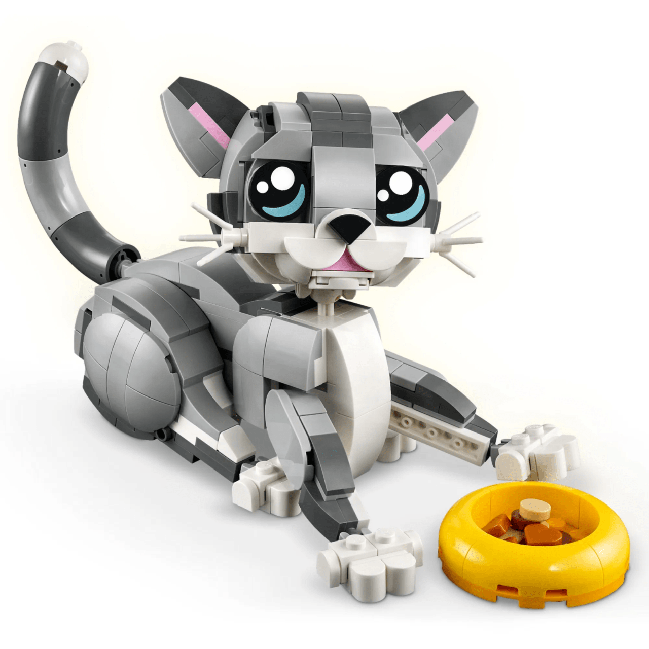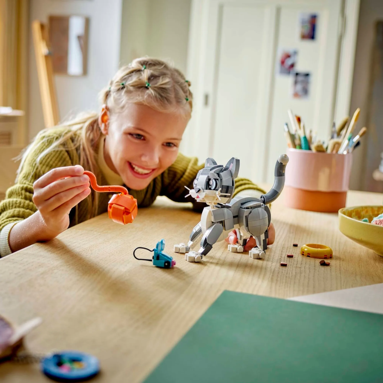 As crianças podem construir três diferentes animais com os mesmos tijolos sendo um gato articulado que pode sentar, ficar de pé e pular, um cachorro fofo, também articulado, com um osso, e um pombo com migalhas de pão. Com essas três opções, este conjunto é o presente perfeito para as crianças exibirem suas criações e aproveitarem momentos de brincadeira imaginativa.