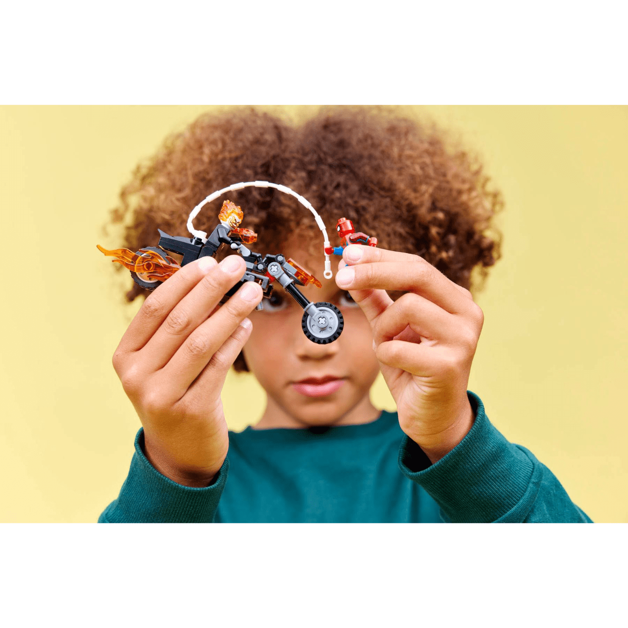 O conjunto inclui duas minifiguras do Homem-Aranha e do Motoqueiro Fantasma, além de uma motocicleta pronta para a batalha. A figura do Motoqueiro Fantasma aparece como um esqueleto com chamas na cabeça e nas mãos, enquanto o veículo icônico possui escapamentos em chamas e dois disparadores de projéteis para muita diversão.