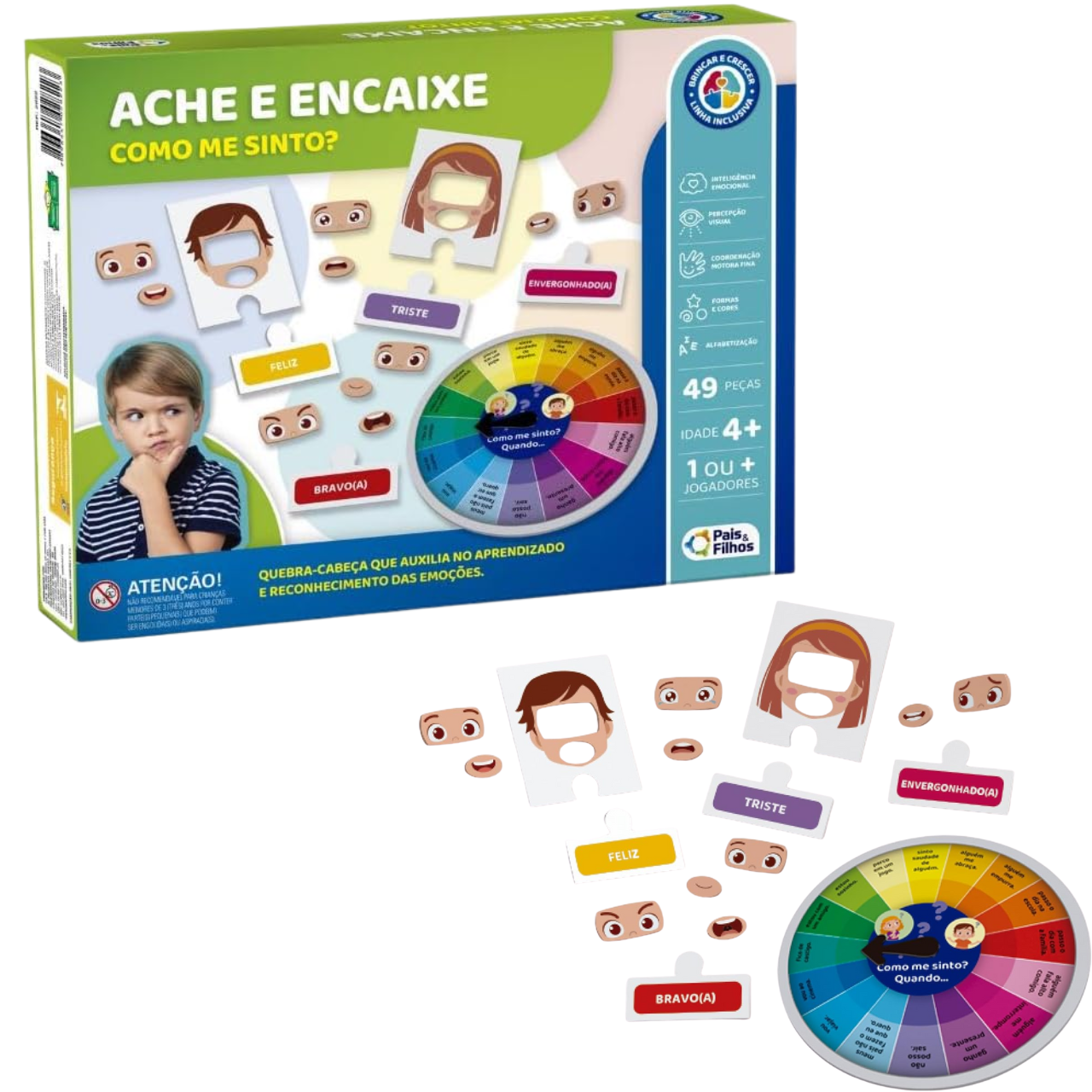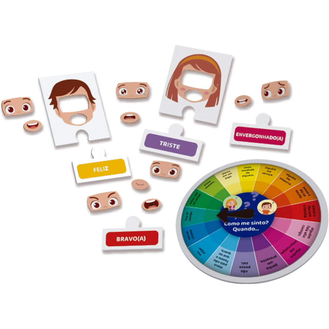 Composto por 49 peças coloridas e resistentes, o jogo funciona como um quebra-cabeça interativo. Os participantes utilizam uma roleta multicolorida para selecionar perguntas e, a partir disso, devem montar expressões faciais que representem diferentes emoções. As peças são encaixadas como um quebra-cabeça, permitindo que a criança relacione a emoção à sua representação visual e à sua nomenclatura.