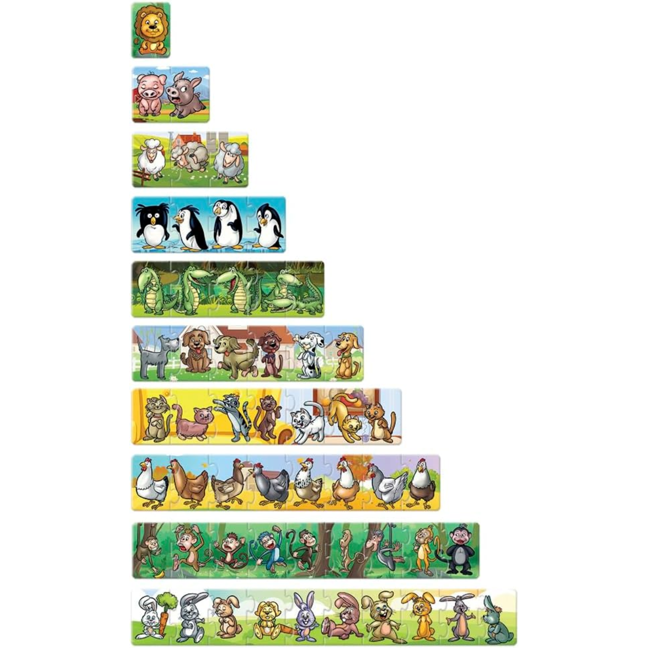 Para facilitar a montagem, eles são representados por diferentes animais e todos eles têm um cenário contínuo. Assim, a criança pode juntar as peças de duas maneiras: tanto com base nos animais quanto no fundo!