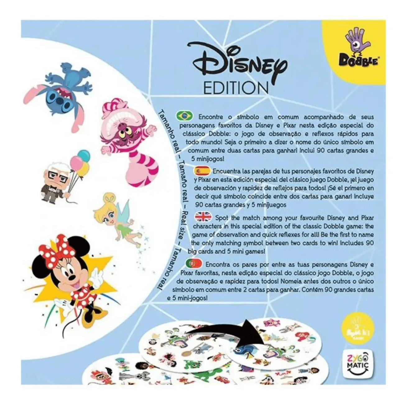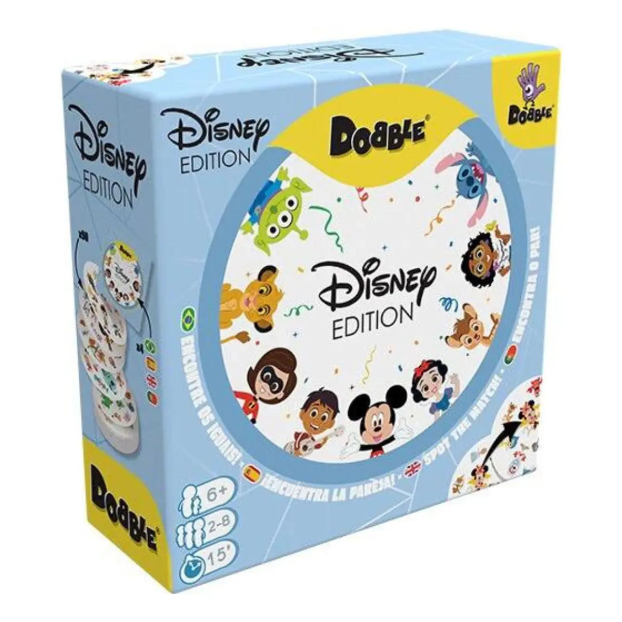 Em Dobble Disney, cada carta possui vários símbolos e sempre existe apenas um símbolo em comum entre qualquer duas cartas. O objetivo é ser o mais rápido a identificar esse símbolo correspondente entre a sua carta e a carta revelada no centro da mesa (ou entre cartas dos jogadores, dependendo da variação da partida). Assim que encontrar o símbolo igual, diga em voz alta o nome do personagem ou objeto e pegue a carta ou realize a ação indicada pela regra escolhida.