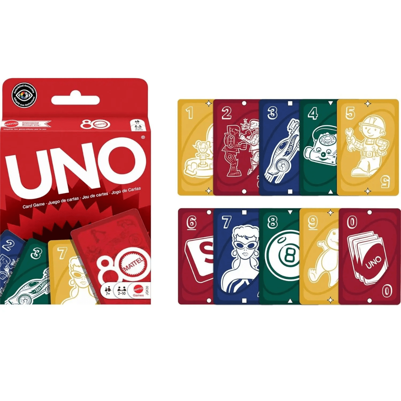 O Jogo de Cartas Uno Aniversário 80 Anos é uma edição comemorativa especial do clássico jogo de cartas, lançada para celebrar os 80 anos da Mattel, uma das maiores empresas de brinquedos do mundo. Este baralho exclusivo traz um design elegante e vibrante, com detalhes em vermelho rubi e gráficos inspirados nos produtos e brinquedos icônicos da Mattel ao longo das décadas.