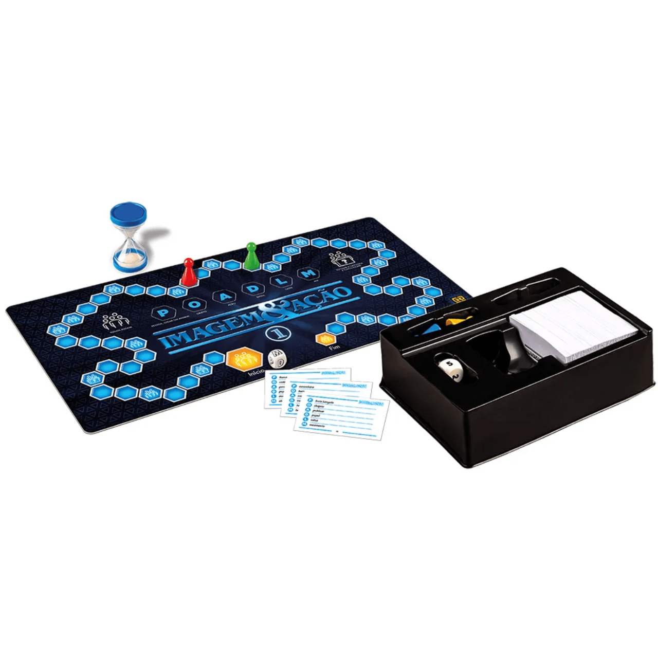 1 tabuleiro, 1 ampulheta, 198 cartas, 4 peões, 1 dado e 1 manual de instruções