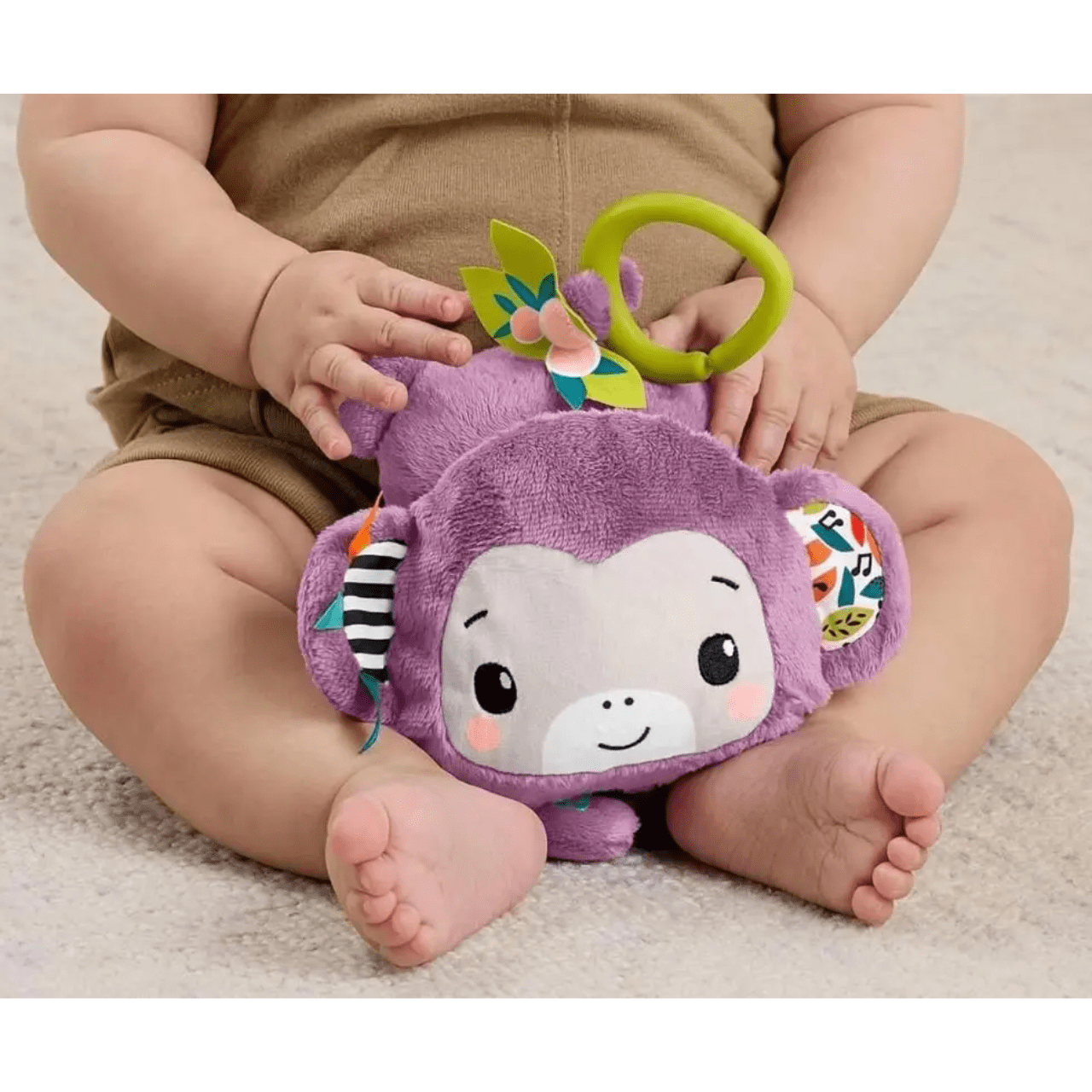 Este Macaquinho Musical apresenta a popular melodia do Macaco Roxo, originária do renomado Deluxe Kick & Play Piano Gym. Ao puxar e soltar os chocalhos, a música e outros sons divertidos são ativados.