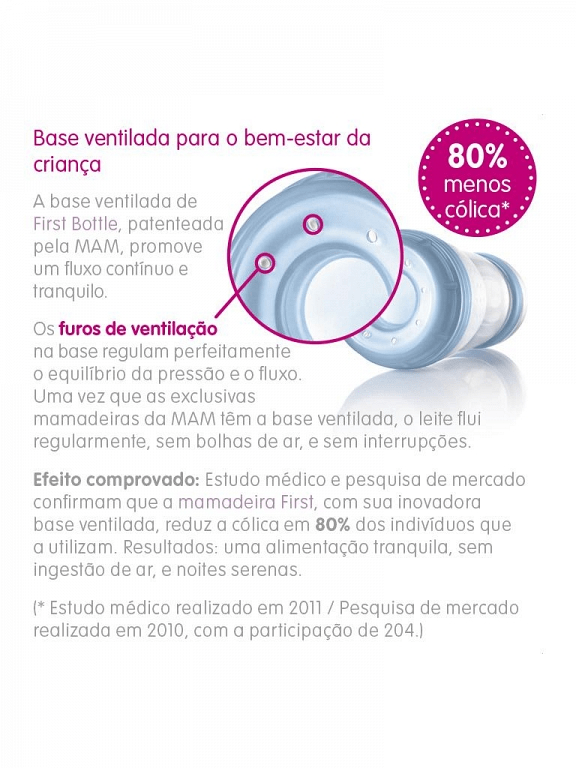 - Menos cólicas e regurgitação graças à base ventilada que proporciona um fluxo regular sem interrupção. Menos cólica confirmado por 80% das mães