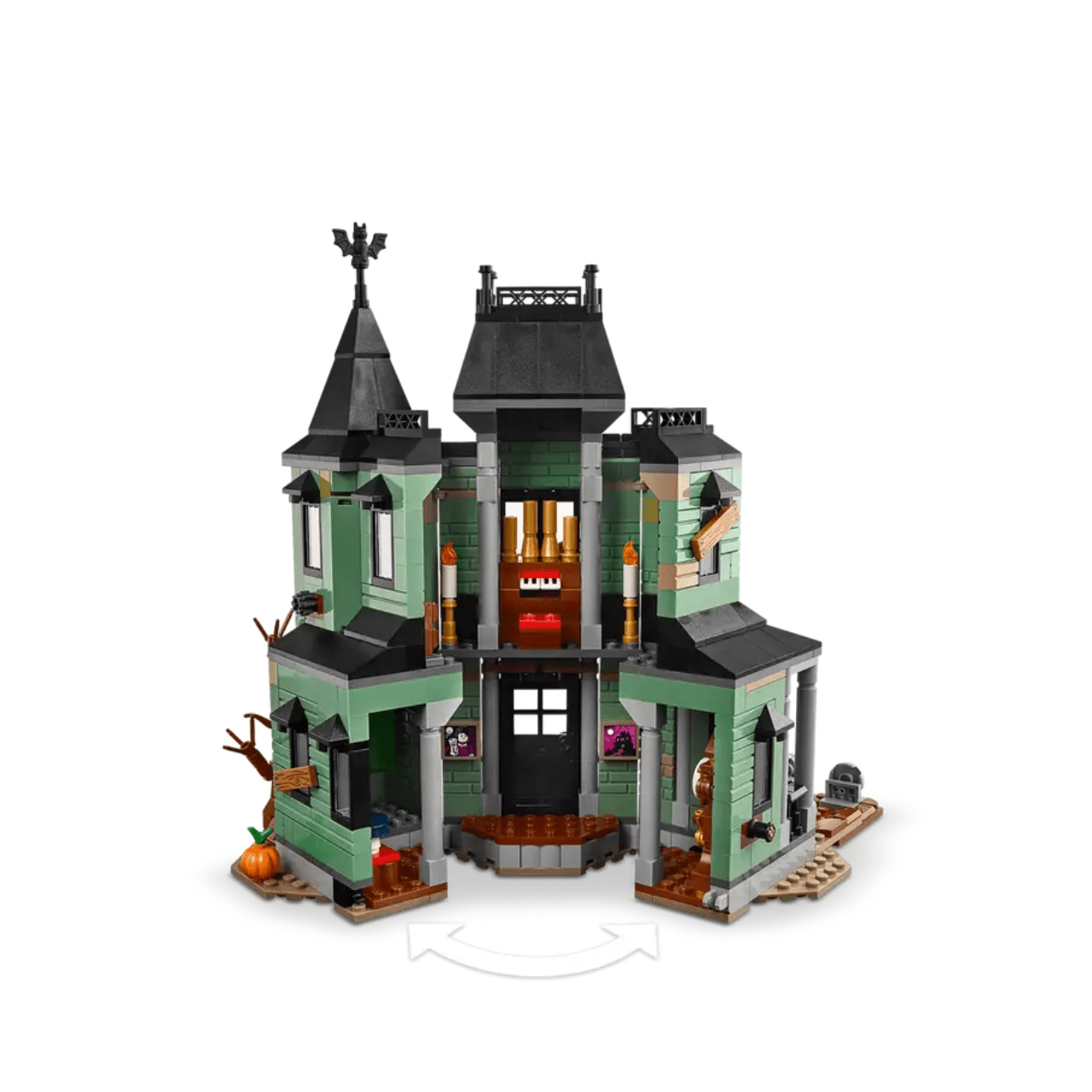 A mansão assombrada de 2 andares é repleta de detalhes que tornam a brincadeira ainda mais divertida. Com um portão de entrada que abre, um cemitério sombrio, uma árvore assustadora desmontável e um órgão misterioso, o conjunto oferece muitos elementos para criar uma atmosfera única. O grande destaque fica por conta de um fantasma escondido, que se revela ao girar uma roda secreta, e uma parte traseira que se abre, proporcionando ainda mais possibilidades de exploração.