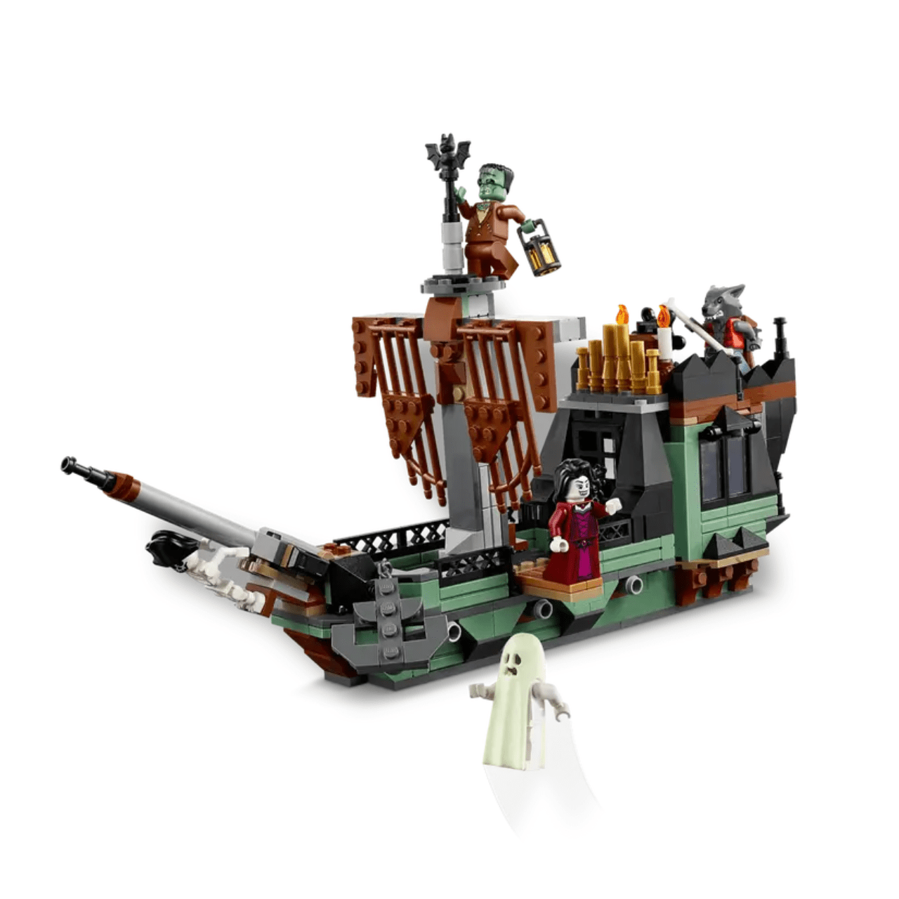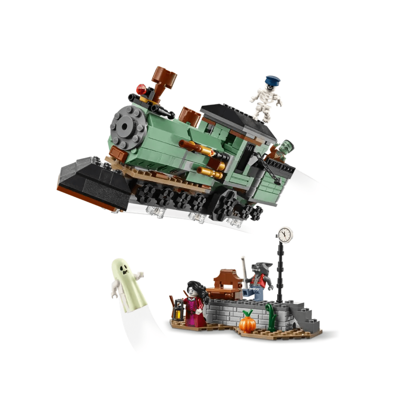 - O conjunto inclui 5 minifiguras temáticas: um lobisomem, um vampiro, um fantasma com capa que brilha no escuro, o monstro de Frankenstein e um esqueleto.