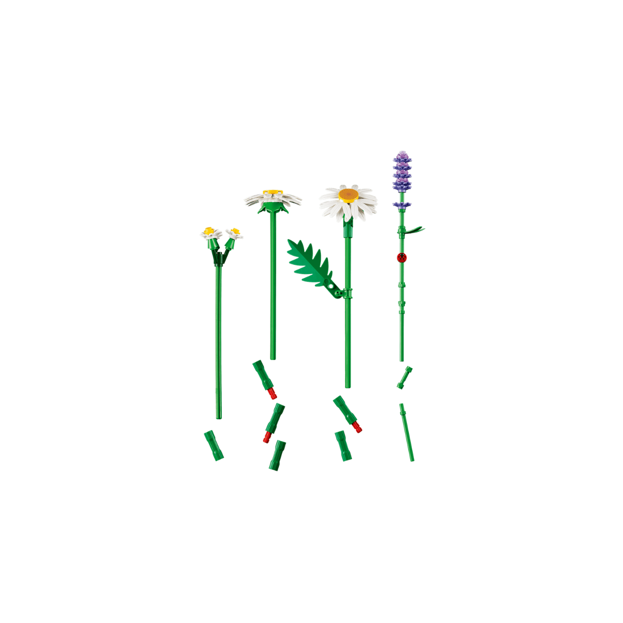O conjunto é indicado para crianças a partir de 9 anos que permite montar um buquê de flores detalhado e realista, incluindo 3 margaridas grandes, 2 caules de margaridas pequenas, 3 alfazemas e caules verdes vibrantes. O conjunto ainda traz uma fofa joaninha em um dos caules de alfazema, tornando a construção ainda mais divertida e encantadora.