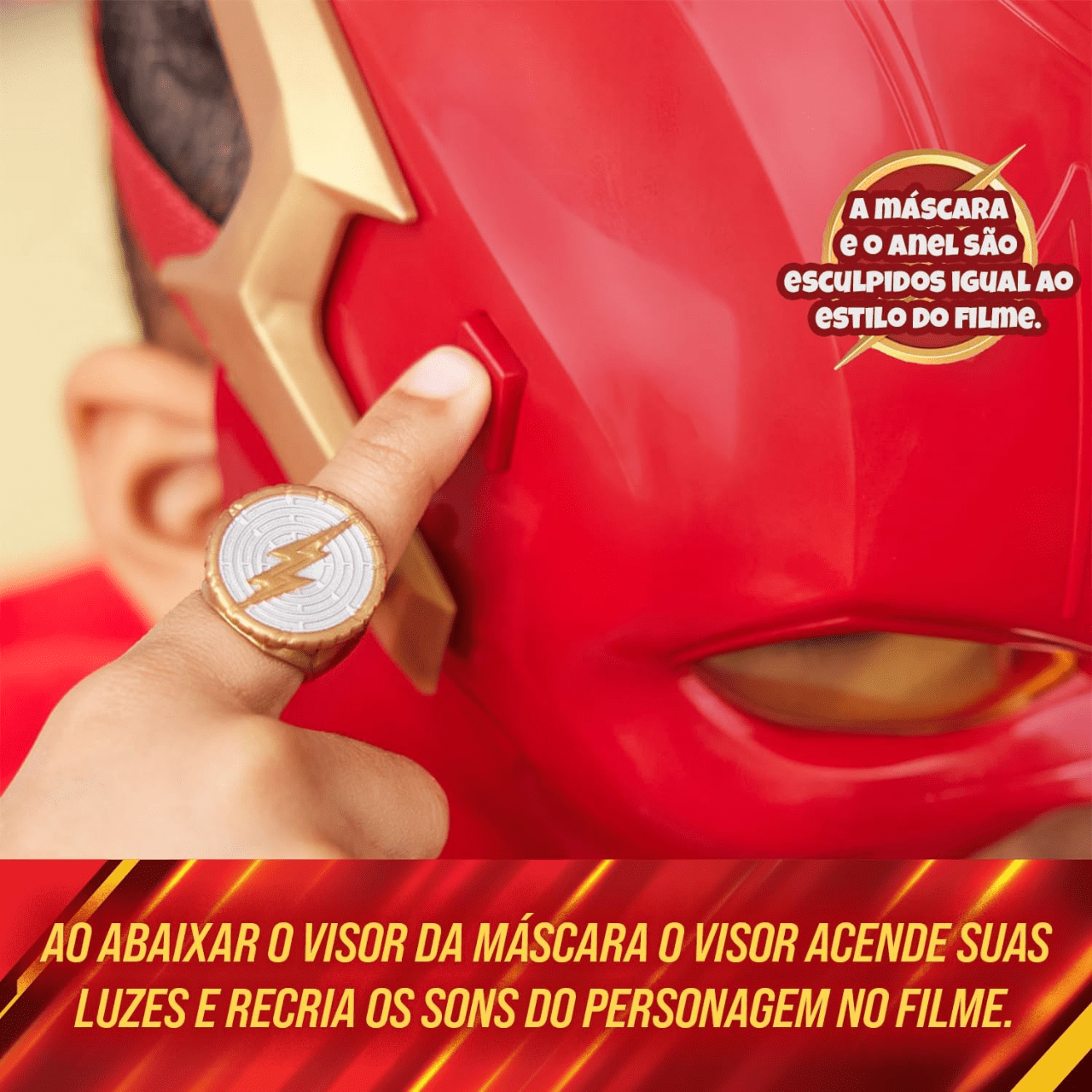 O anel do Flash e a máscara detalhadamente esculpida foram feitos com o mesmo estilo e acabamento vistos no filme, perfeitos para fãs, colecionadores e pequenos heróis em treinamento.