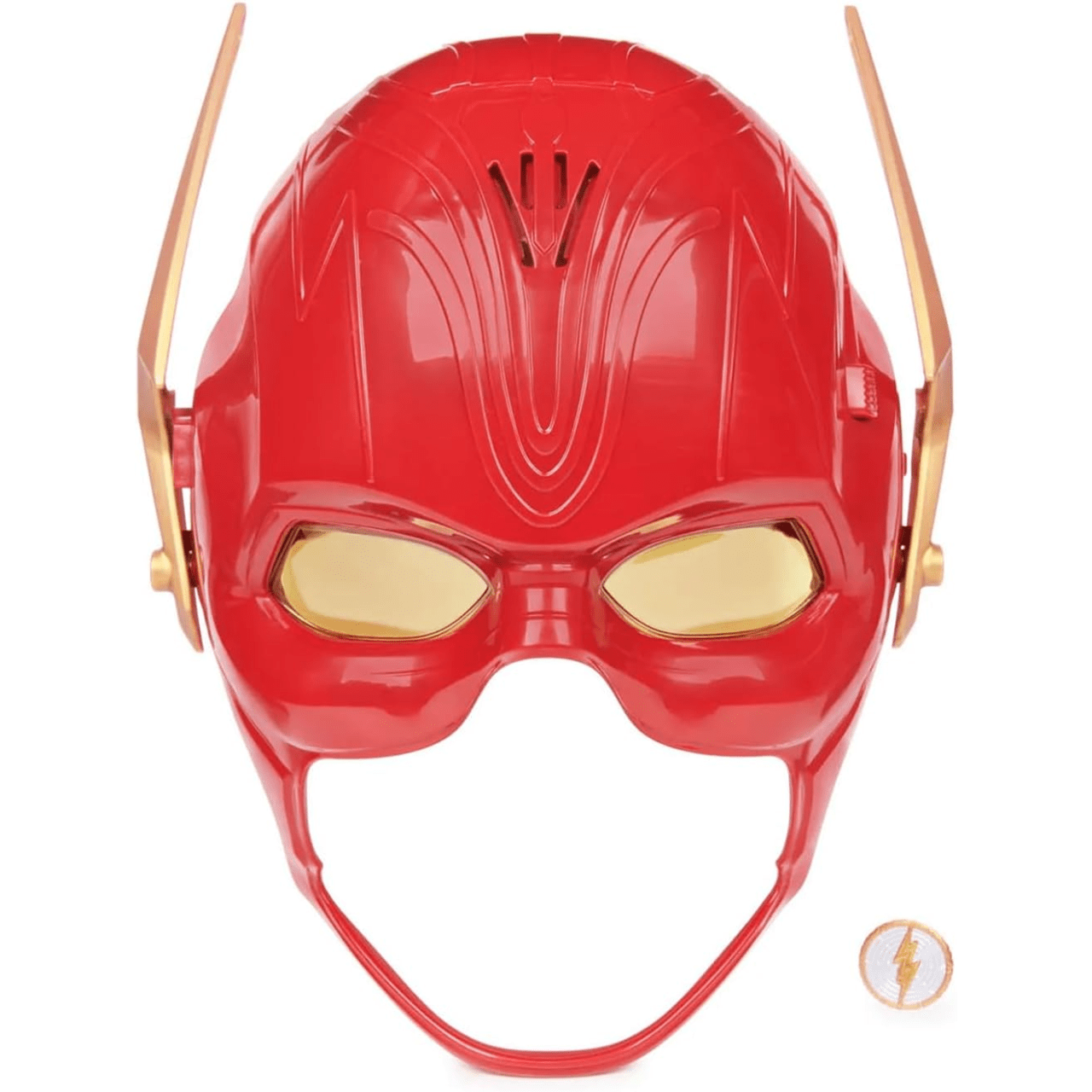 - Máscara e anel com detalhes inspirados diretamente no visual do Flash do cinema.