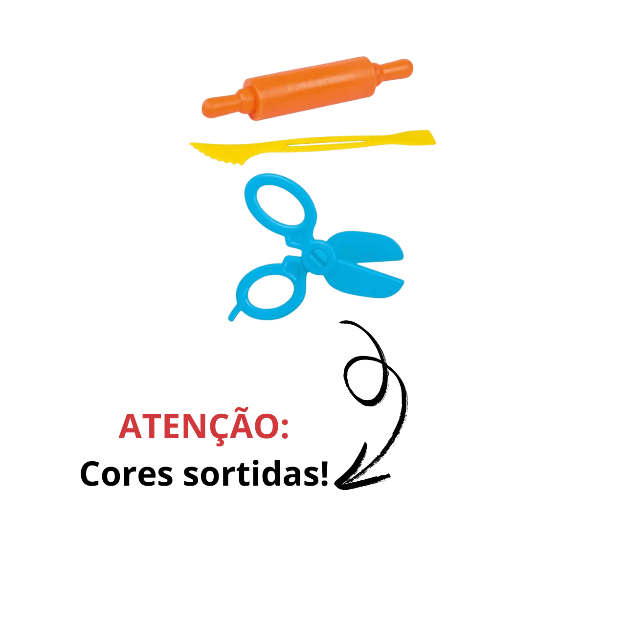 Conteúdo da embalagem: 4 Potes de massinha (cores sortidas) de 50g, 2 Forminhas G, 2 Forminhas P, 2 Êmbolos, 1 Tesoura, 1 Espátula e 1 Rolinho.