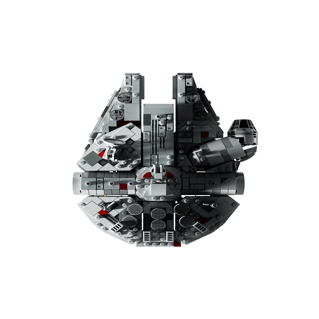 O modelo acompanha um suporte especialmente desenvolvido para exibir a Millennium Falcon em um ângulo dinâmico, simulando voo. Acompanha, ainda, uma placa de identificação e uma peça comemorativa dos 25 anos da linha Lego Star Wars, consolidando o conjunto como uma peça central nostálgica e de grande apelo visual.