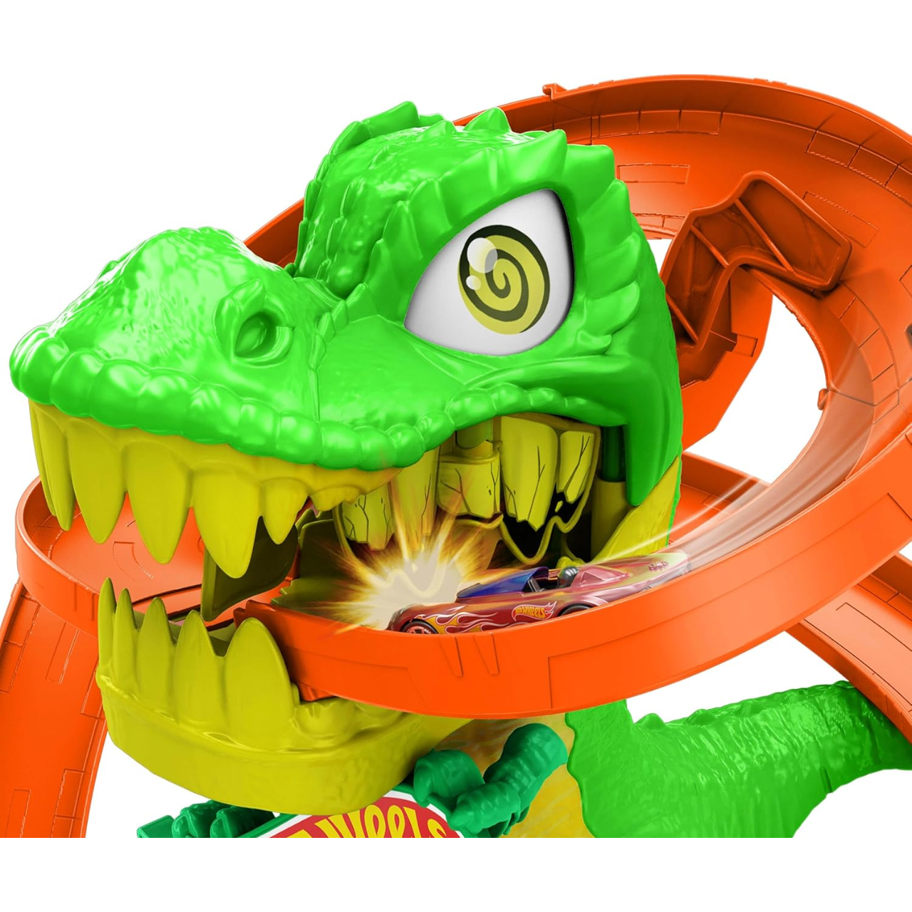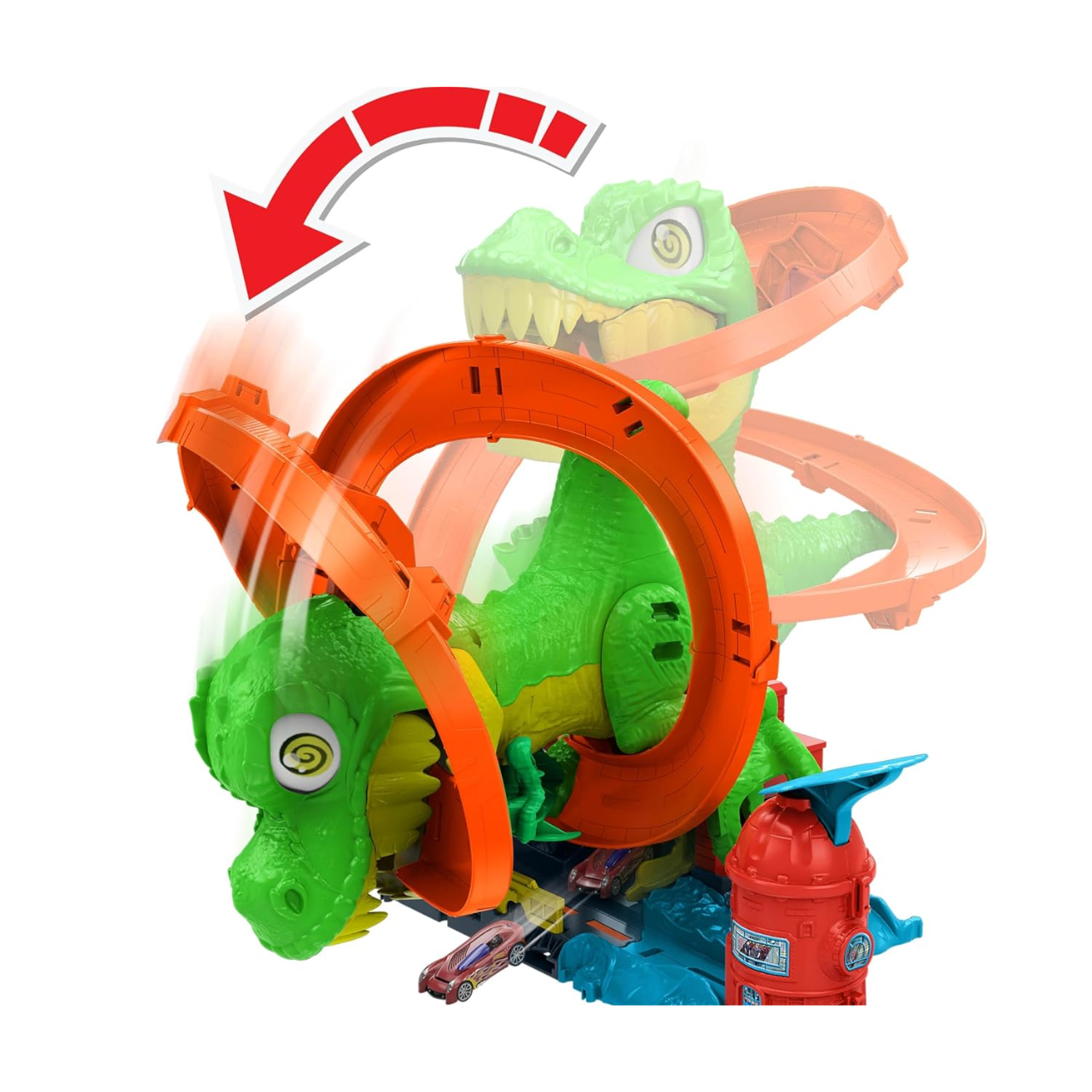 O conjunto apresenta um dinossauro nêmesis de grande escala, com olhos que giram toda vez que os carros passam e o objetivo é nocauteá-lo antes que ele destrua tudo!