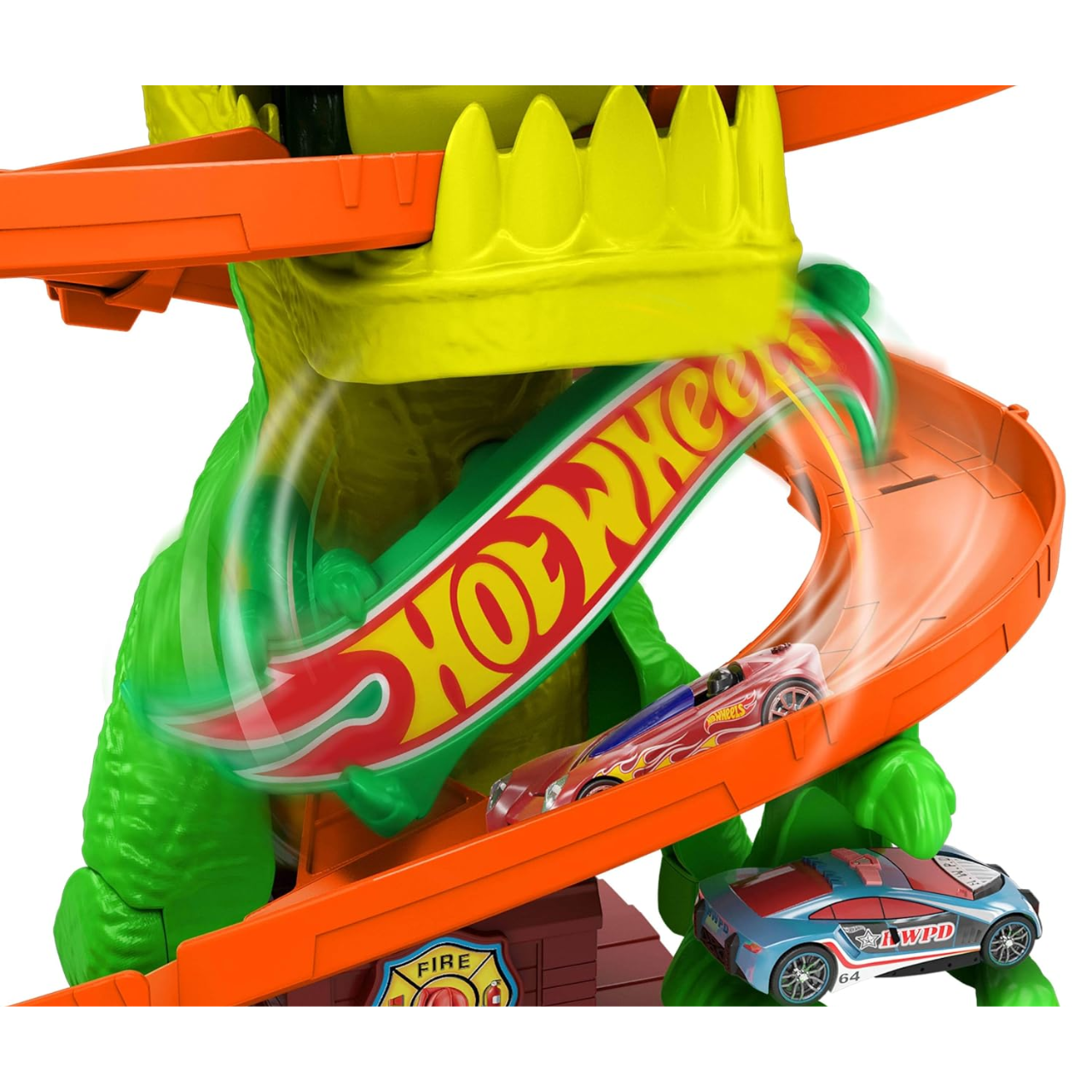 Prepare-se para um desafio épico em Hot Wheels City! Um T-Rex faminto atacou o quartel de bombeiros, e agora é sua missão resgatar a cidade! Com um carrinho Hot Wheels em escala 1:64, você enfrentará o dinossauro gigante em uma batalha de velocidade e estratégia.