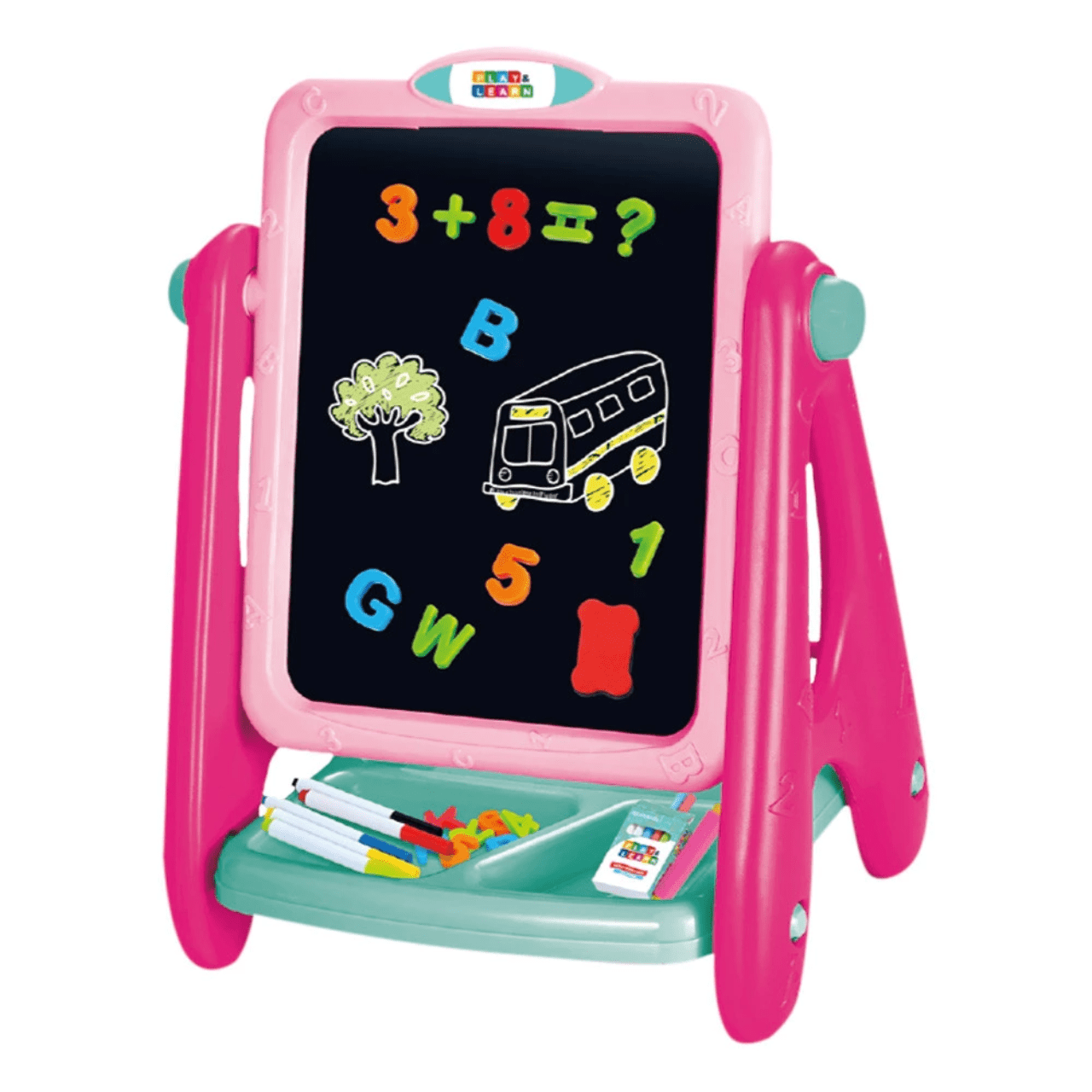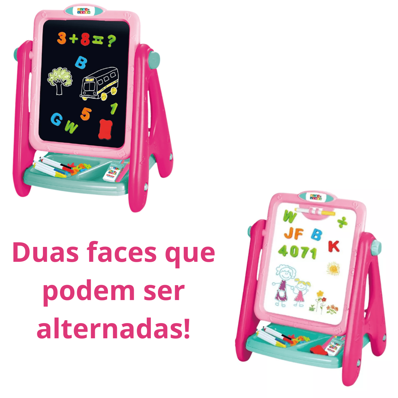 Conteúdo da embalagem: 1 Lousa e quadro negro 2 em 1, 5 Canetinhas, 12 Gizes de cera, 52 Números e letras, 1 Apagador e 1 Ficha de giz.