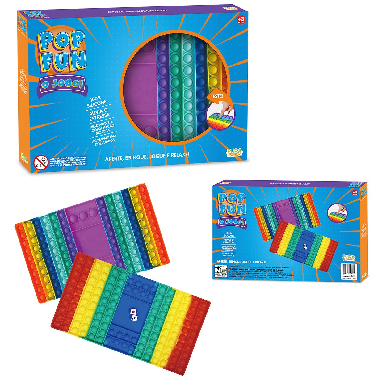 Conteúdo da embalagem: 1 tabuleiro Pop It de 32 x 17 cm (cores variadas), 2 dados.