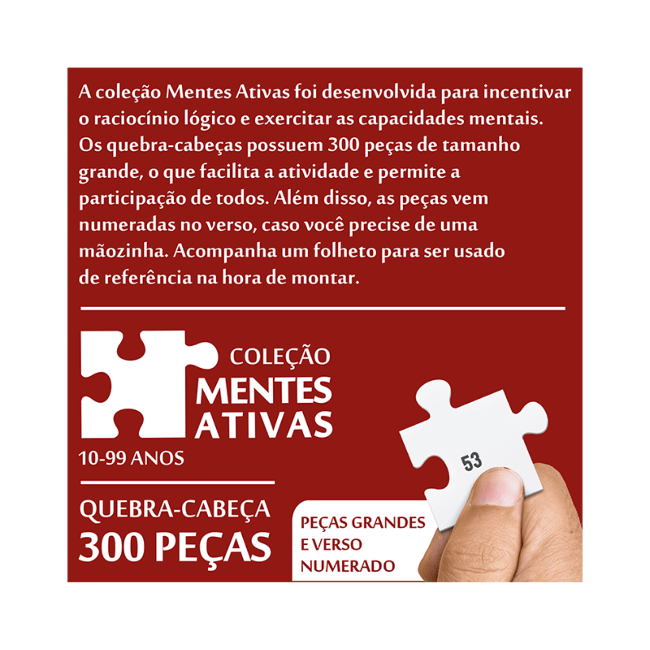 Com peças grandes e resistentes, este quebra-cabeça é perfeito para quem deseja exercitar o cérebro enquanto se diverte. Sua montagem gradual oferece uma experiência agradável e estimulante, que ajuda a melhorar o foco, a concentração e a coordenação motora.
