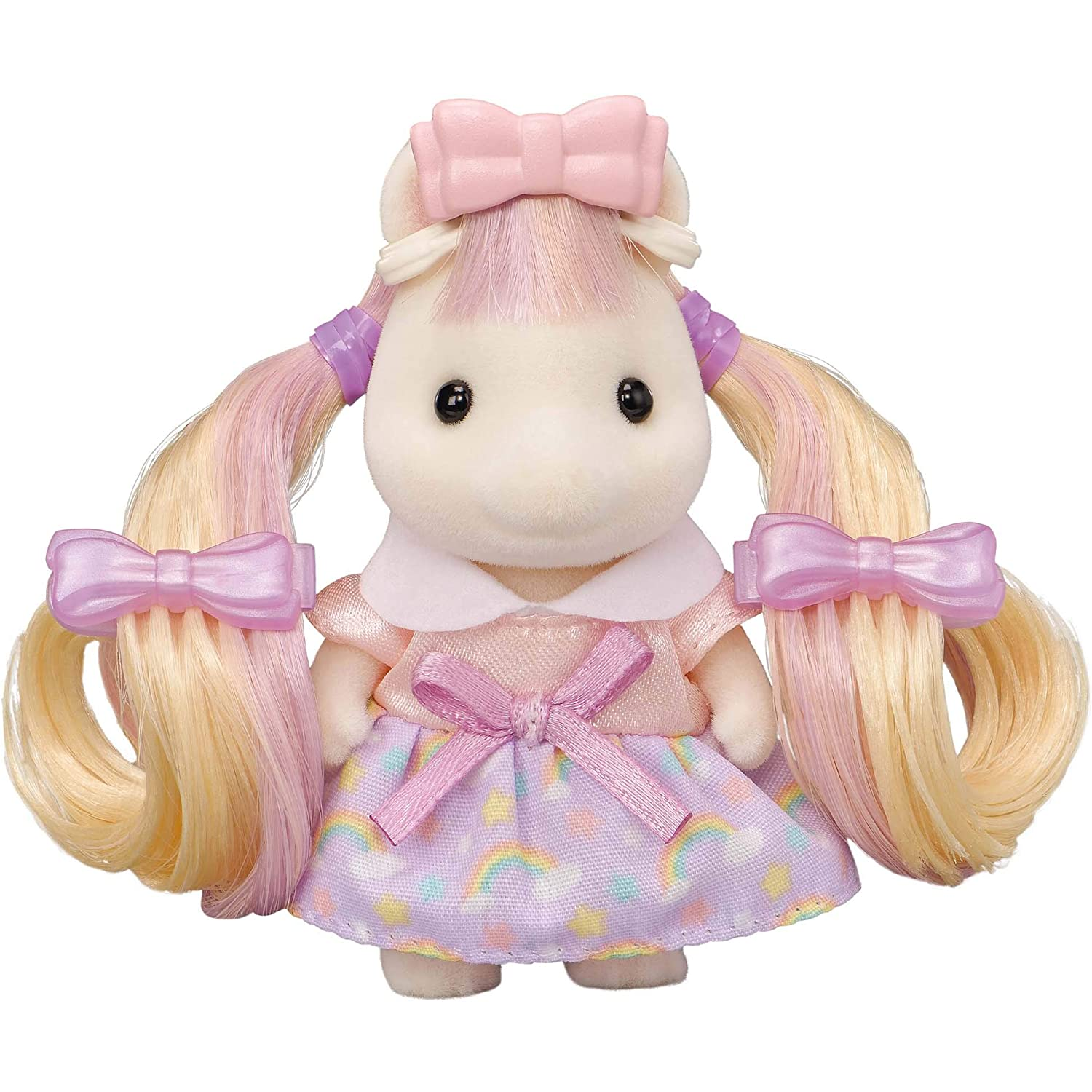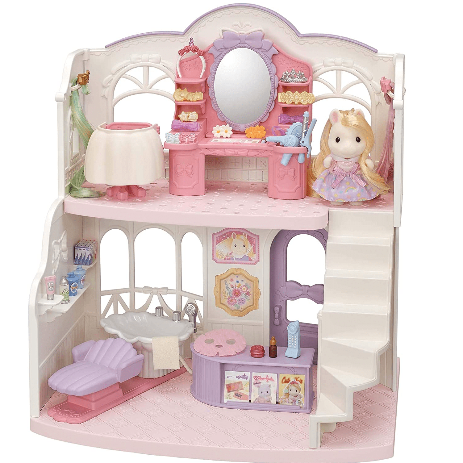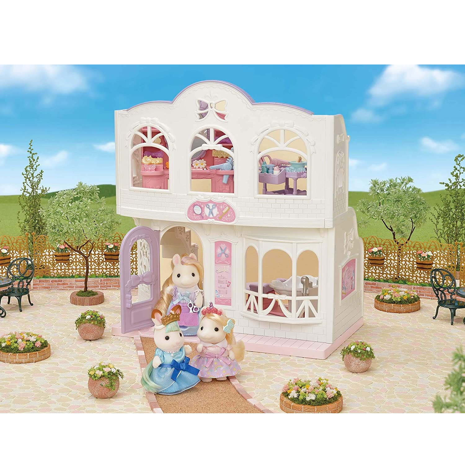 Conteúdo da embalagem: 1 Pônei Sally, 1 Prédio de dois andares, 1 boneco, 1 Escova, 1 Secador, 1 Pia, 1 Cadeira, 1 Livro de penteados e acessórios para cabelo