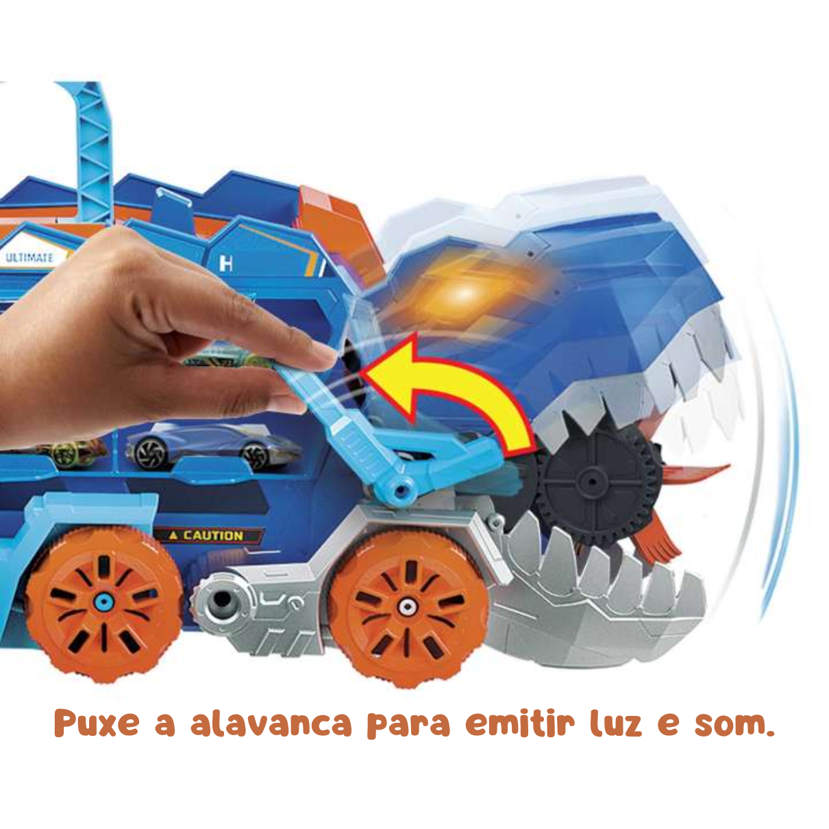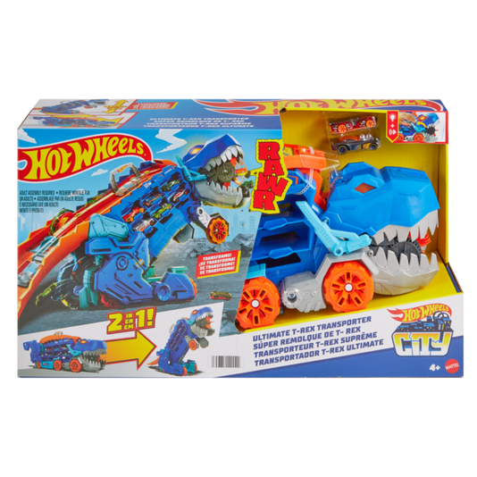 O T-Rex pode engolir e transportar mais de 20 carros em escala 1:64. No modo transportador, puxe-o pela alça e veja-o comer os carros em seu caminho. Abaixe a cauda e ela se transforma em um Robo T-Rex com luzes e sons e uma pista de corrida de duas faixas. As crianças também podem lançar carros de sua boca!