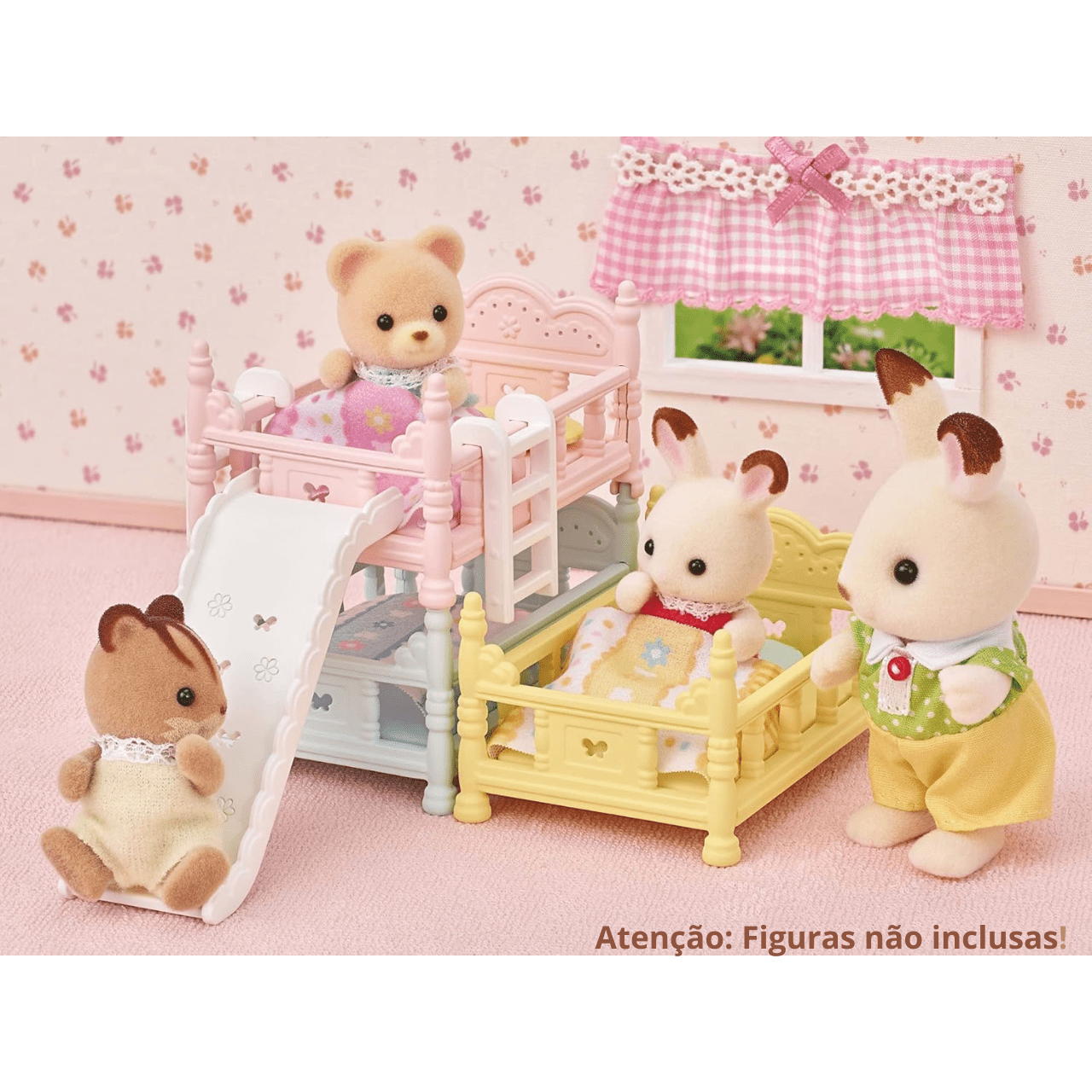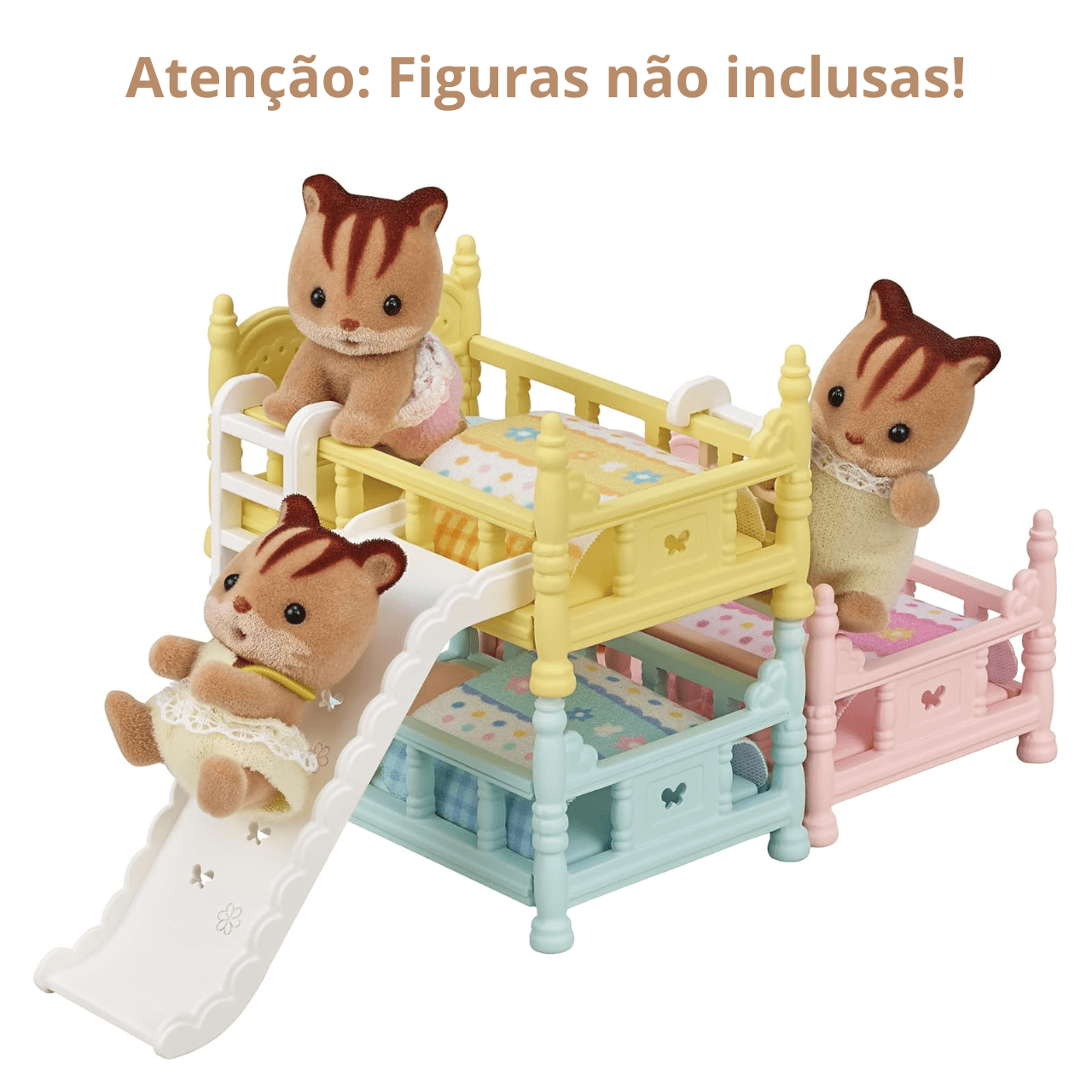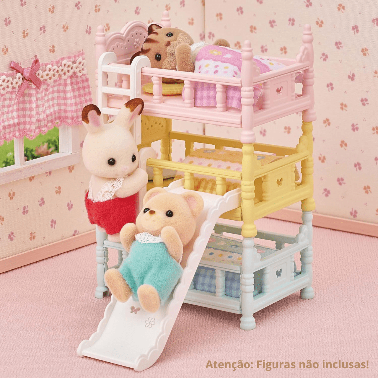 Este conjunto acompanha três beliches para bebês Sylvanian Families, o conjunto oferece múltiplas opções de arranjo: as camas podem ser montadas uma sobre a outra, ao lado da outra, ou em outros layouts criativos.